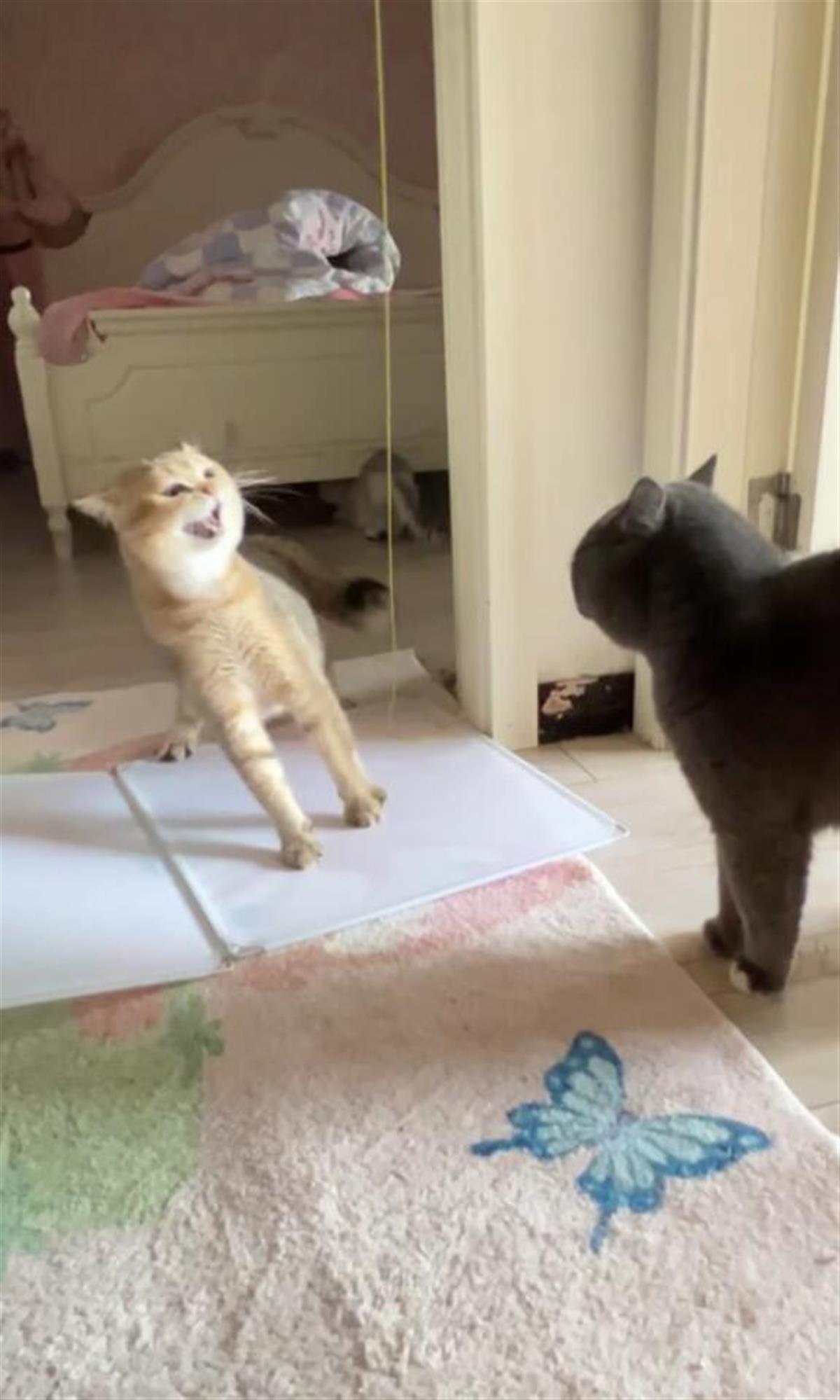 据一段社交平台的视频显示,一只颜色较深的猫站在门口,与一只黄色个头较小的猫对视,这两只猫不时发出喵喵的叫声,还有一只银白色的小猫向黄色小猫走来。黄色小猫不断发出叫声,随后身体开始倾斜。