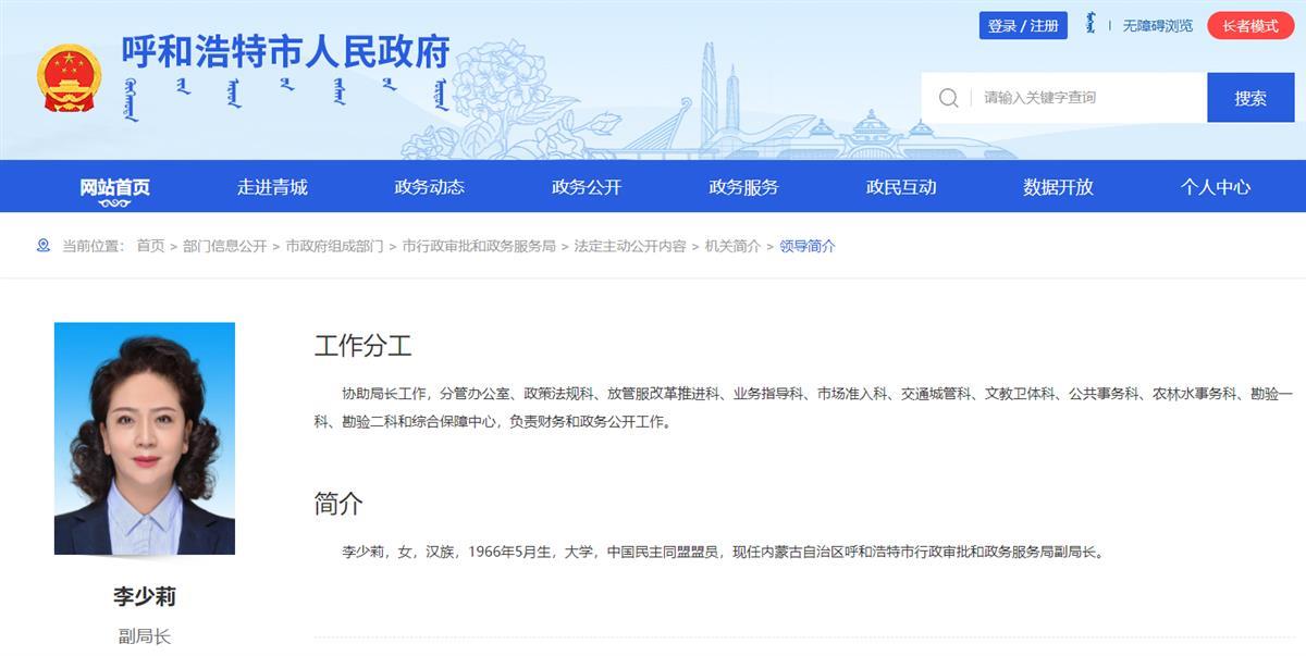 公开信息显示,李某莉,1966年5月生,现任内蒙古自治区呼和浩特市行政审批和政务服务局副局长,曾先后获得多个荣誉称号。