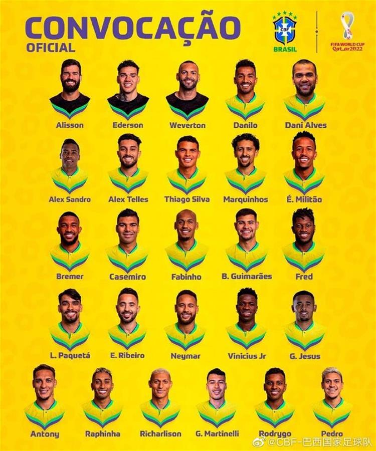 巴西队2022世界杯阵容(图片来源:巴西国家足球队官方微博)