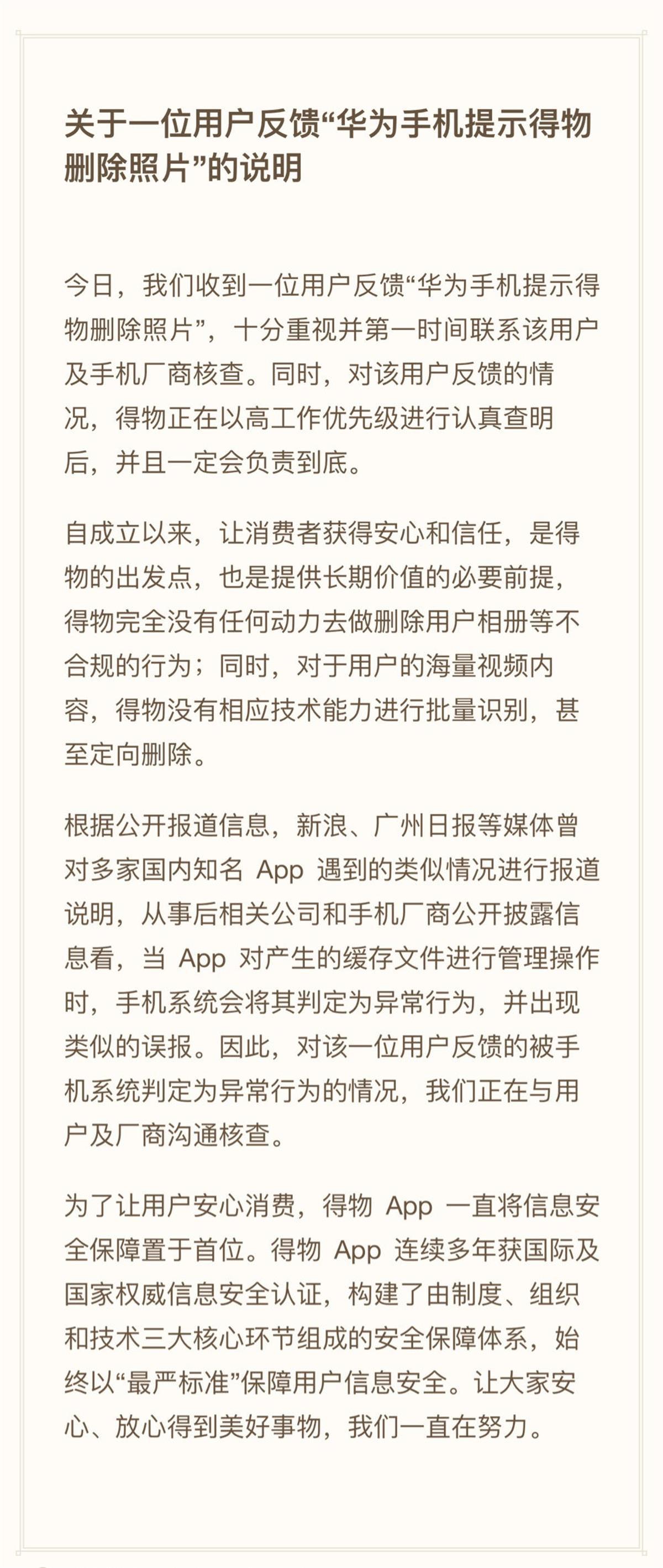 13日下午,得物官方微博发布说明称,他们收到用户反馈“华为手机提示得物删除照片”,十分重视并第一时间联系该用户及手机厂商核查。同时,对该用户反馈的情况,得物正在以高工作优先级进行调查,并且一定会负责到底。