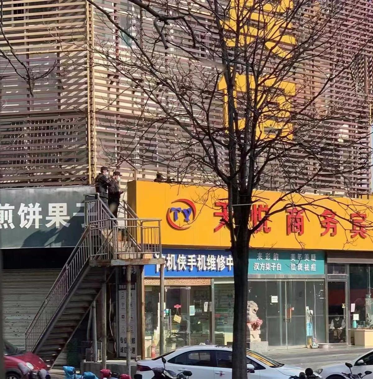 据张先生现场拍摄的图片显示,民警到事发银行马路对面一酒店门口,在挂有酒店招牌的门楼上架设了狙击步枪。极目新闻记者通过地图测距发现,架设狙击步枪的地点,距离银行大门不足百米。