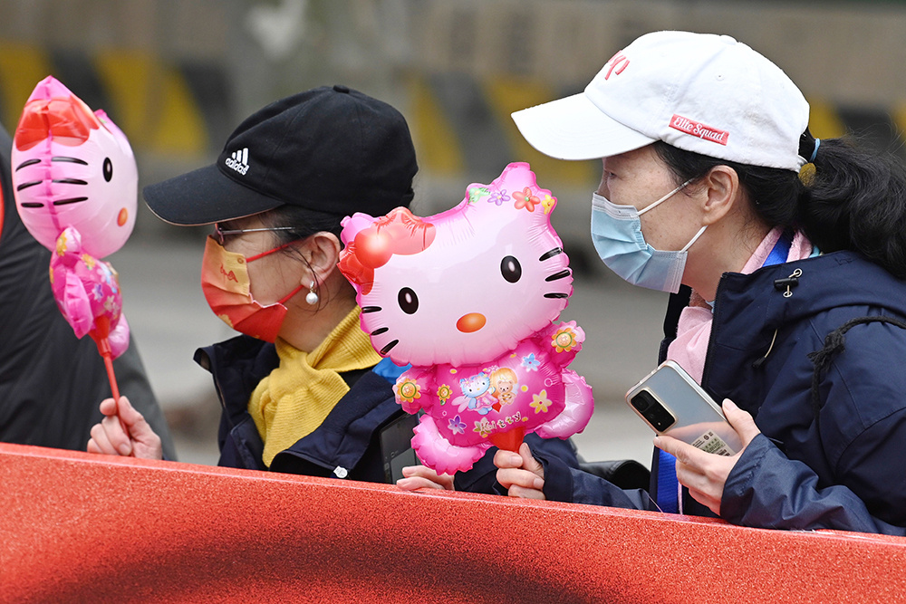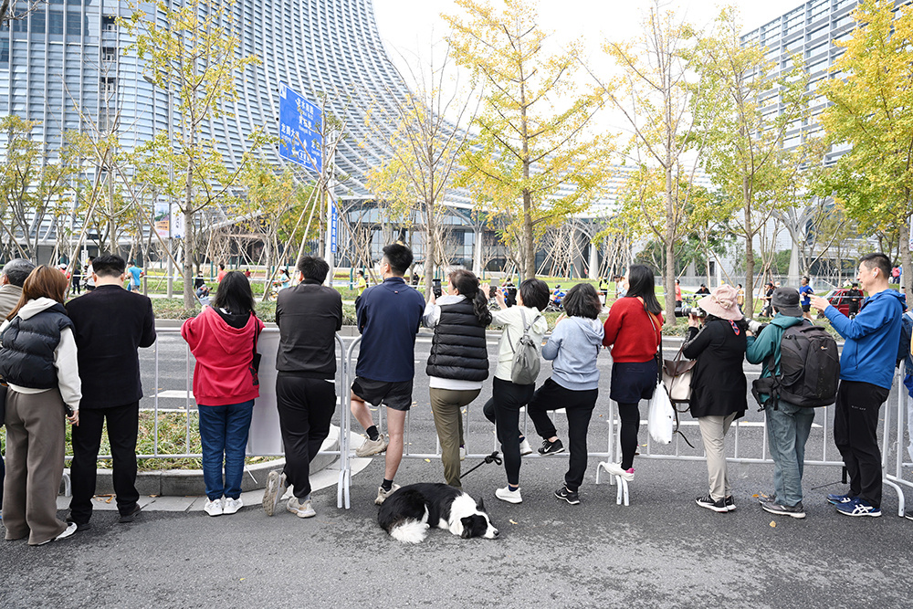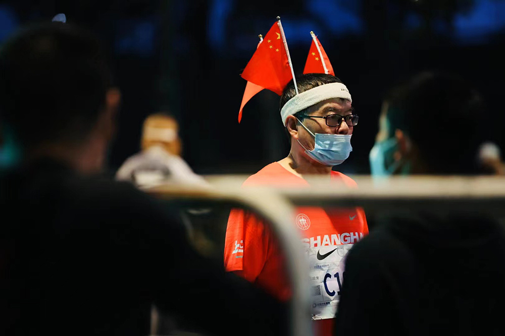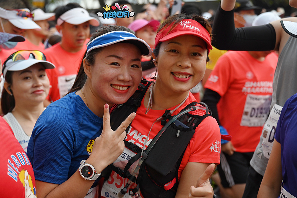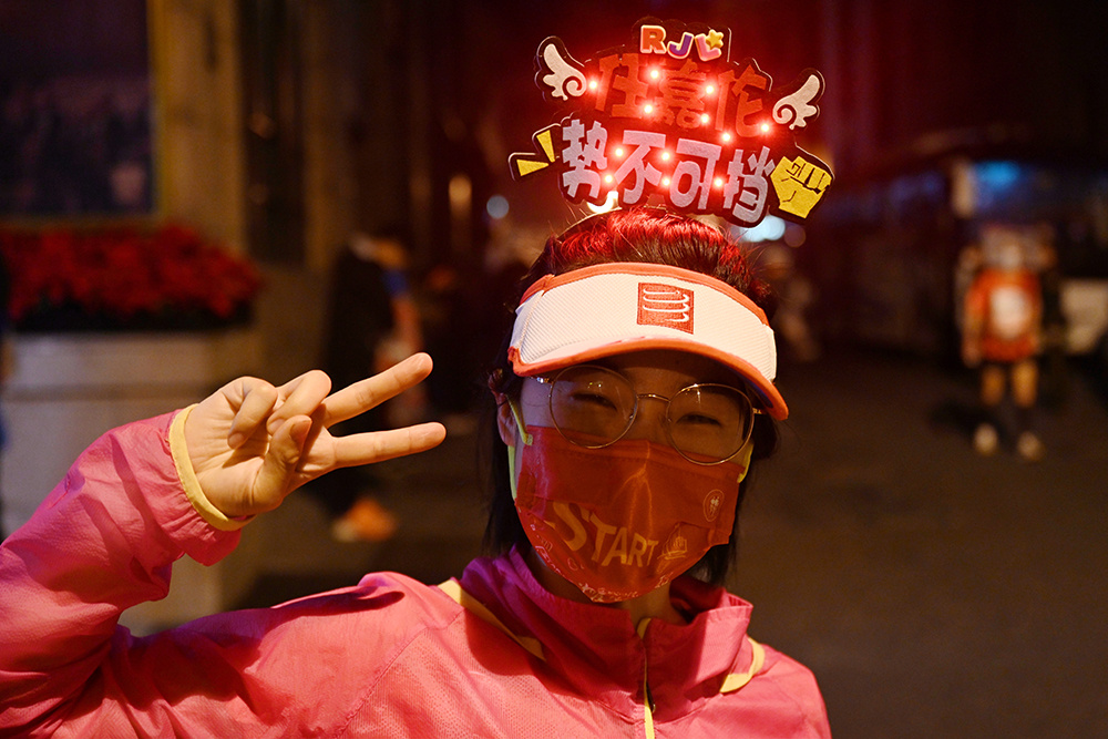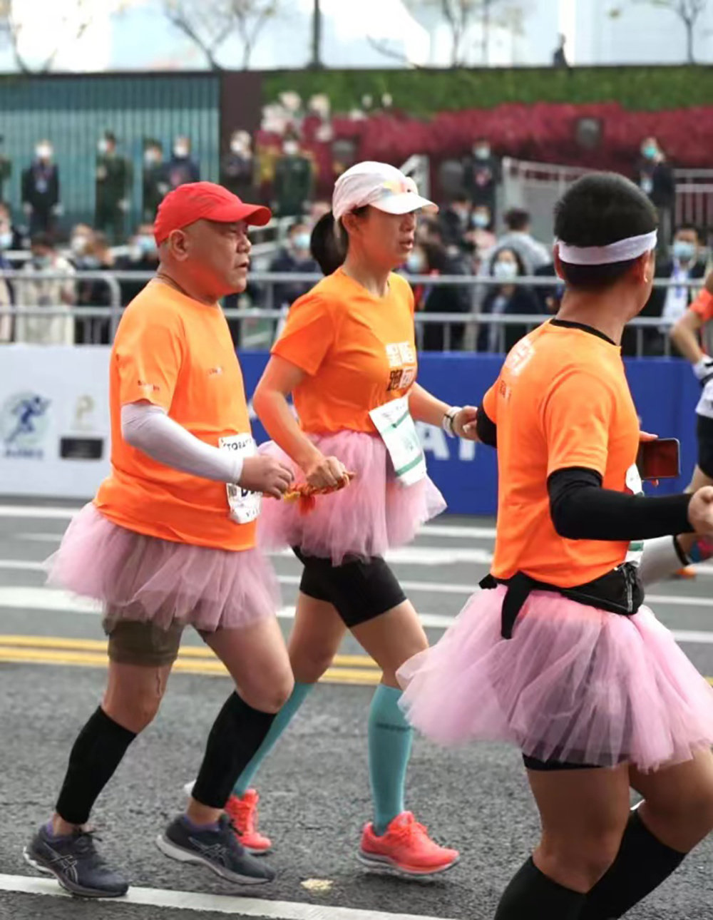 徐女士戴着“势不可挡”头饰给自己加油打气,这是她第二次参赛,“顺利跑完全程就好。”