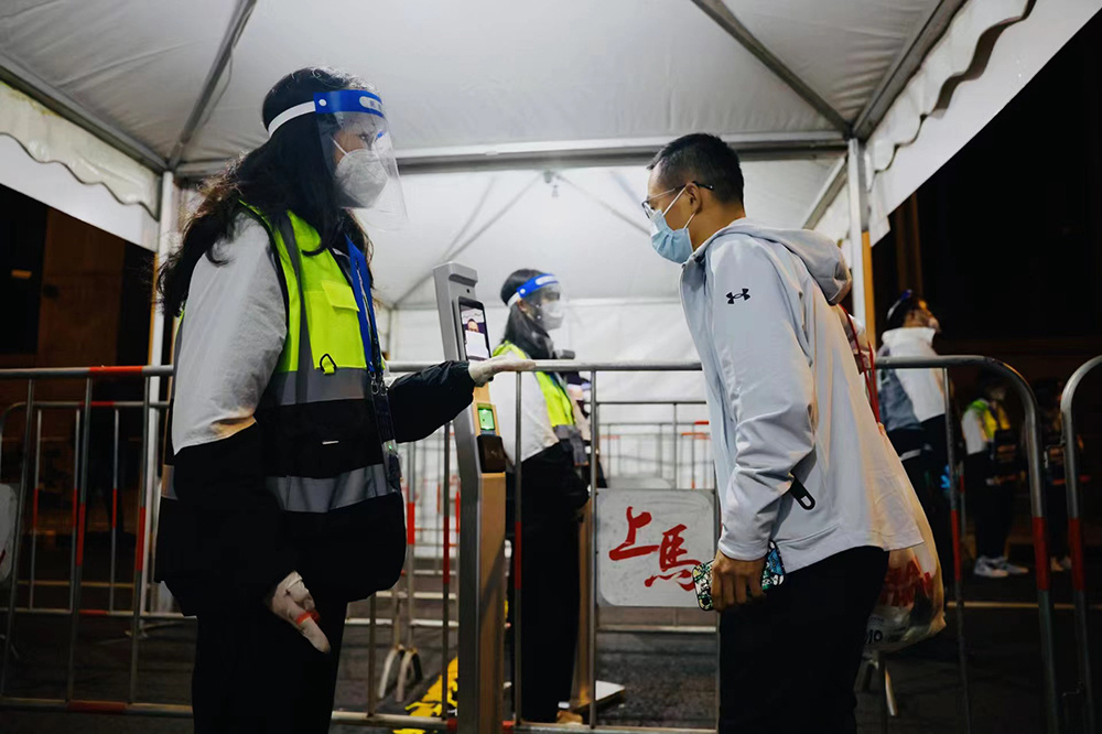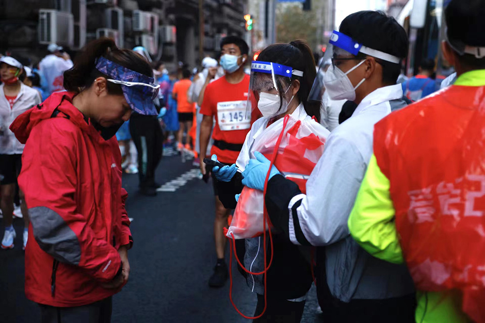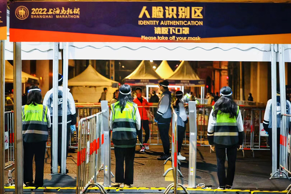 2022年11月27日早上六时许,上海马拉松赛起点,检录处区域的防疫的措施。