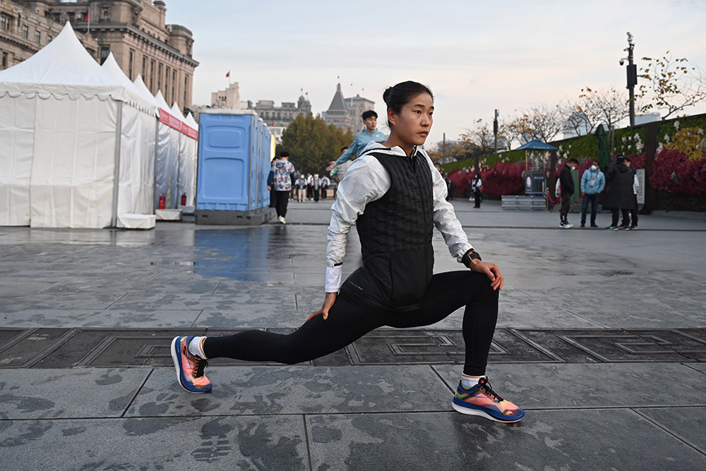 女子特邀运动员第十四届全运会女子5000米及女子3000米障碍赛冠军张新艳,在赛前做热身准备运动。