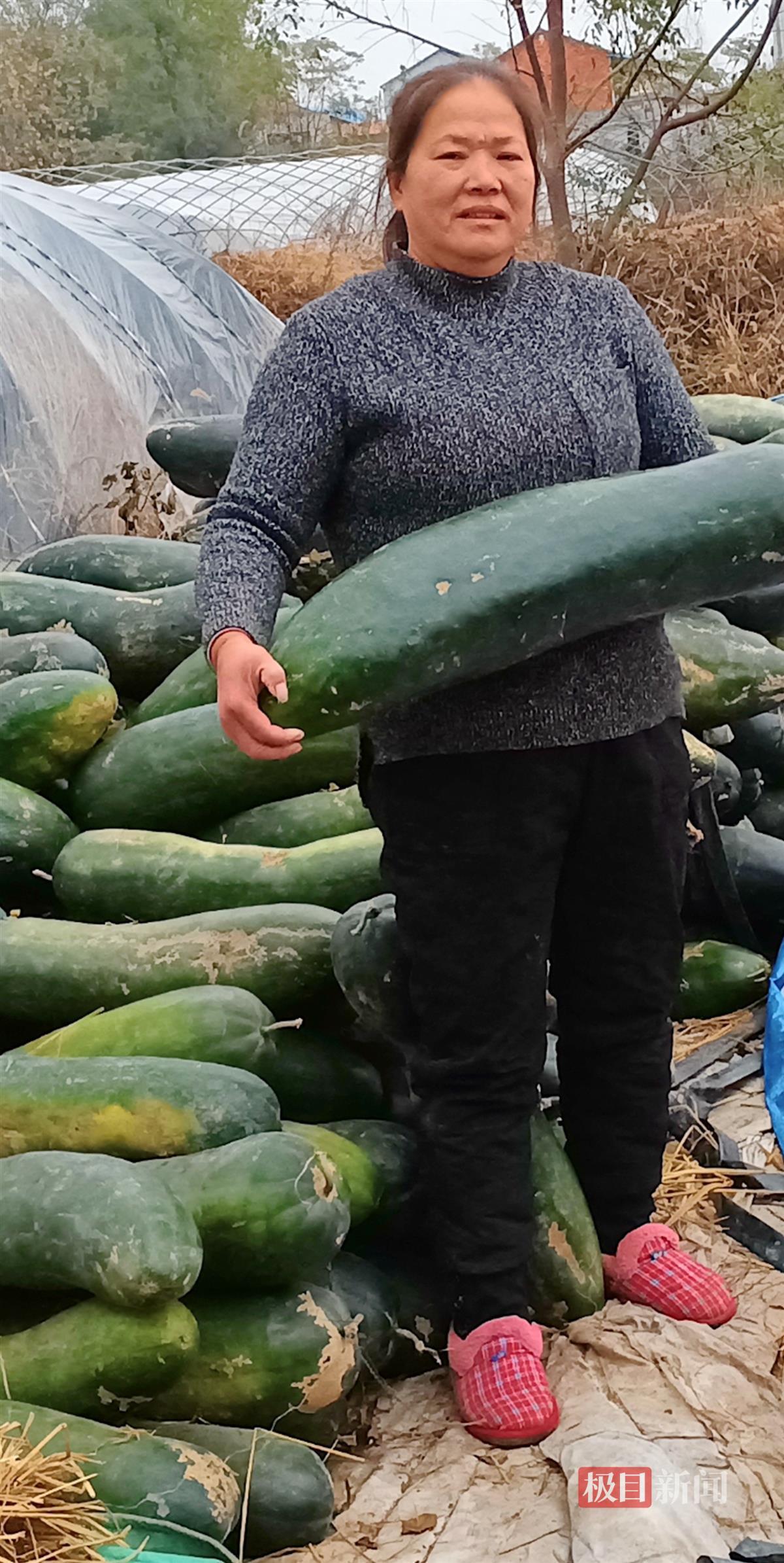 在徐菊英家里,记者看到满满一间房里堆满了南瓜,后院里的地上也摆满了冬瓜。“我们种植的是黑皮冬瓜,最小的有20斤,最大的有40斤。将这些冬瓜从地里搬回家,就花了一天时间。”徐菊英介绍,眼看冬瓜马上就要烂掉了,却只能在周边市场进行售卖,无疑只是杯水车薪。“我们种植的冬瓜是村里主要产业之一,六十户农民依靠它养家糊口。”