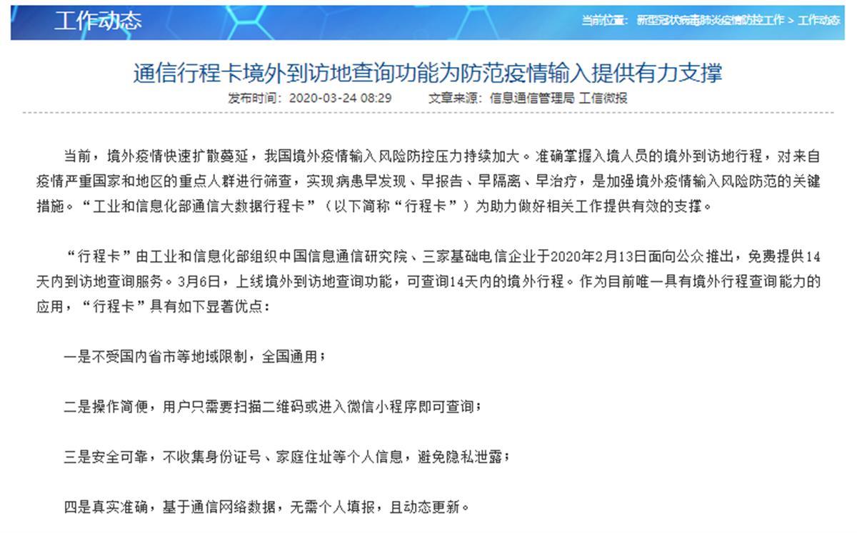 工信部也曾在官网发文称,在当前外防输入的关键时刻,行程卡用通信大数据和信息化的手段,为精准防控构筑起一道安全防线。