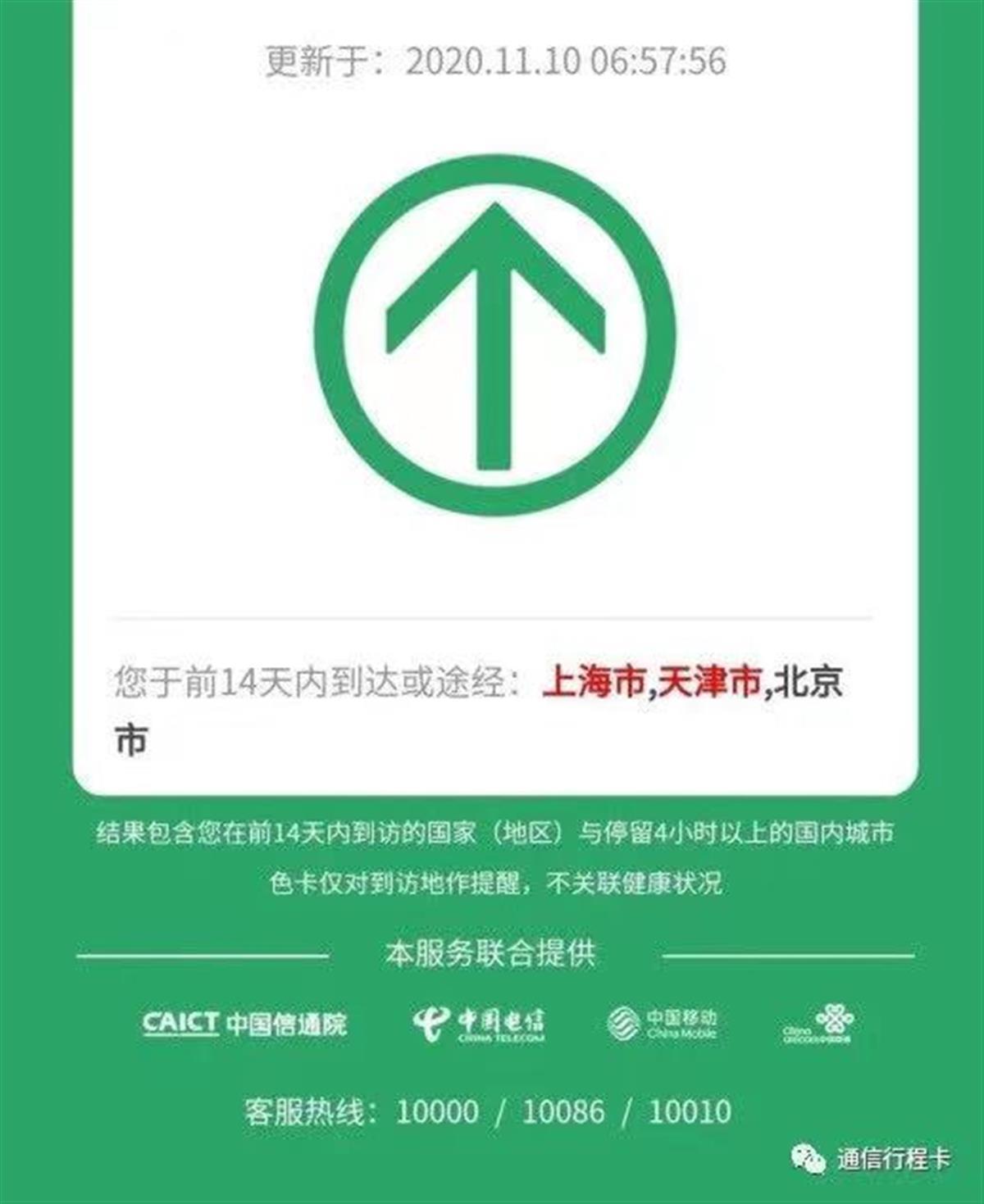 2020年2月13日,工信部组织中国信息通信研究院、三家基础电信企业推出的“工业和信息化部通信大数据行程卡”,正式面向公众。工信部曾在官网发文称,“行程卡”可以免费提供14天内到访地查询服务。