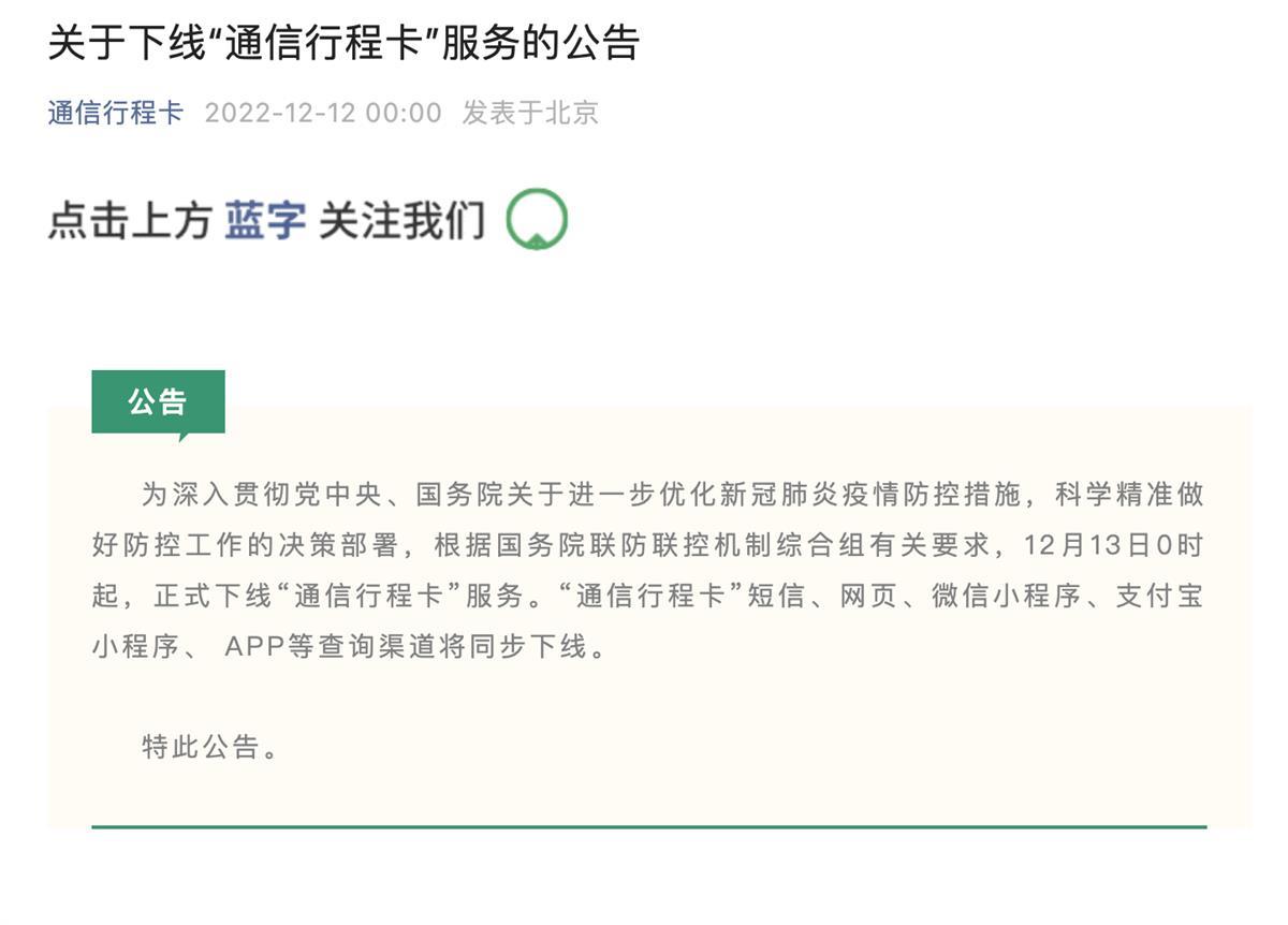12月12日凌晨零时,通信行程卡官方公众号发文称,为深入贯彻党中央、国务院关于进一步优化新冠肺炎疫情防控措施,科学精准做好防控工作的决策部署,根据国务院联防联控机制综合组有关要求,12月13日0时起,正式下线“通信行程卡”服务。“通信行程卡”短信、网页、微信小程序、支付宝小程序、 APP等查询渠道将同步下线。