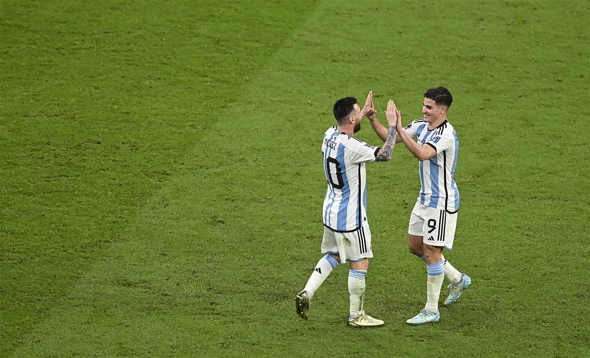 阿尔瓦雷斯与梅西击掌庆祝胜利
