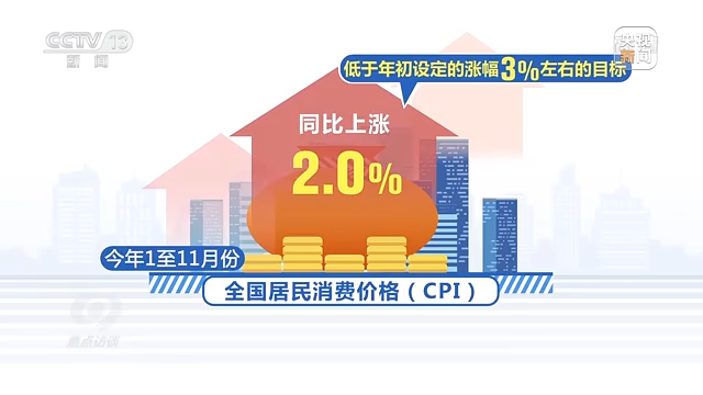物价指标方面,在全球通胀压力上升、输入性通胀压力加大的背景下,今年1至11月份,全国居民消费价格(CPI)同比上涨2.0%,低于年初设定的涨幅3%左右的目标。