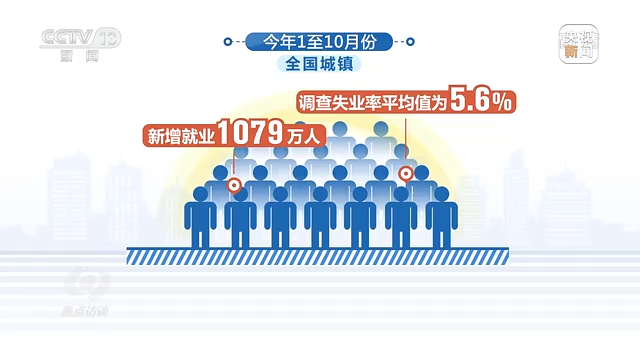 从民生领域看,今年经济社会大局稳定还体现在就业和物价保持基本平稳上。今年1至10月份,全国城镇新增就业1079万人,城镇调查失业率平均值为5.6%。