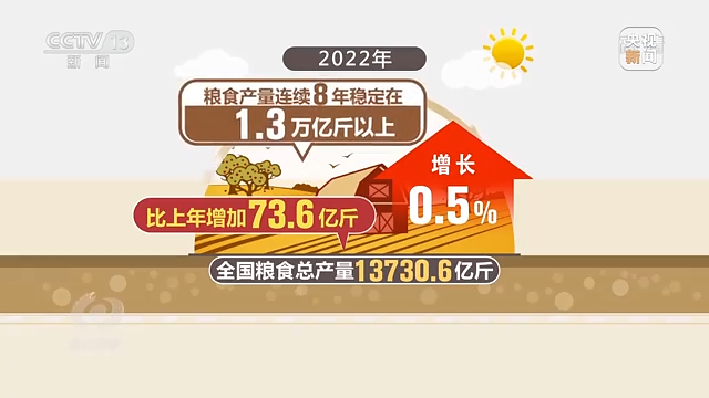 统计显示,2022年全国粮食总产量13730.6亿斤,比上年增加73.6亿斤,增长0.5%,粮食产量连续8年稳定在1.3万亿斤以上。这是在克服去年北方罕见秋汛导致冬小麦晚播和今年南方持续高温干旱等不利因素影响下,取得的增产丰收。粮价是百价之基。今年,中央财政分三批向实际种粮农民下达农资补贴400亿元,比上年翻了一番。