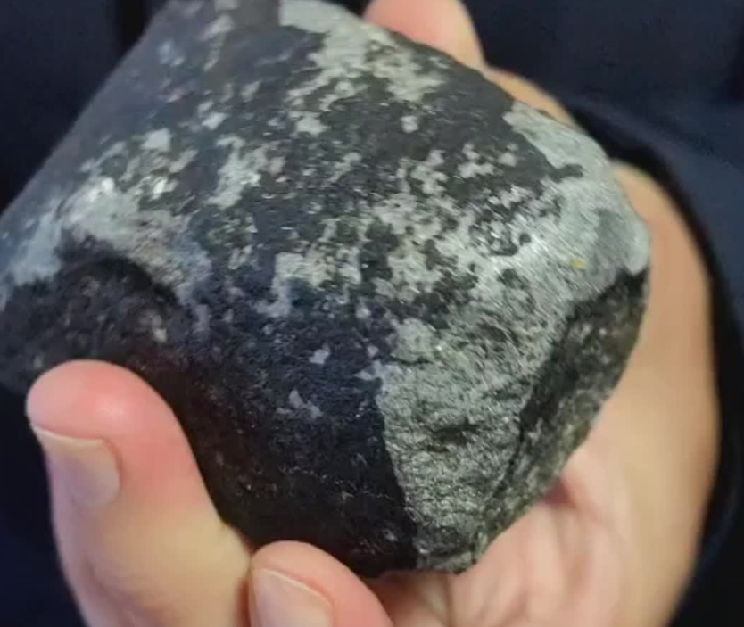 地质队的郁老师告诉记者,目前据肉眼初步判断,表明摩擦力很大,黑色的熔壳是存在的,薄薄的一层大概一毫米左右。里面也确定有一些金属元素,初步确定是天上掉下的陨石,外部特征是有的,初步判断归于石陨石。