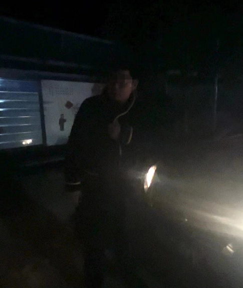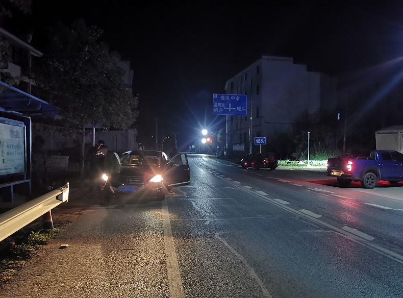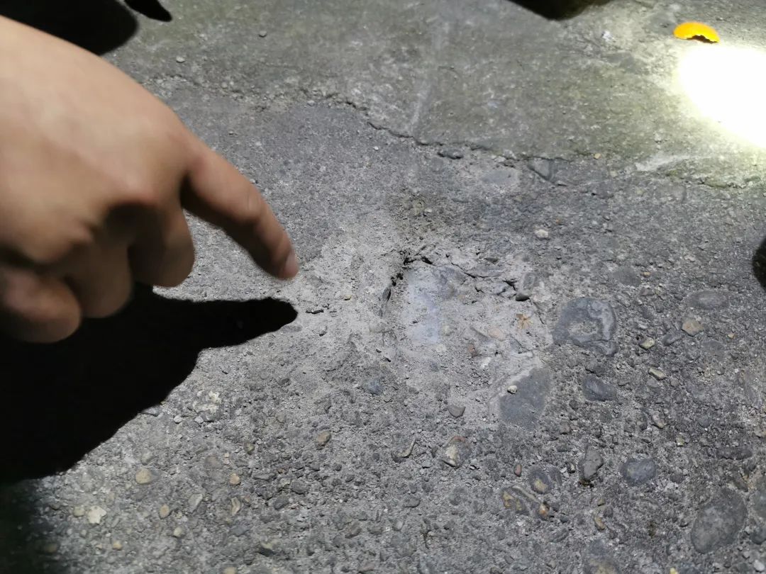 凌晨1点26分,在毛店村一带,一名本地男子在县道停好车,从驾驶室拄着拐杖下来,招呼朋友过来看路中央的一个手掌大小的坑。