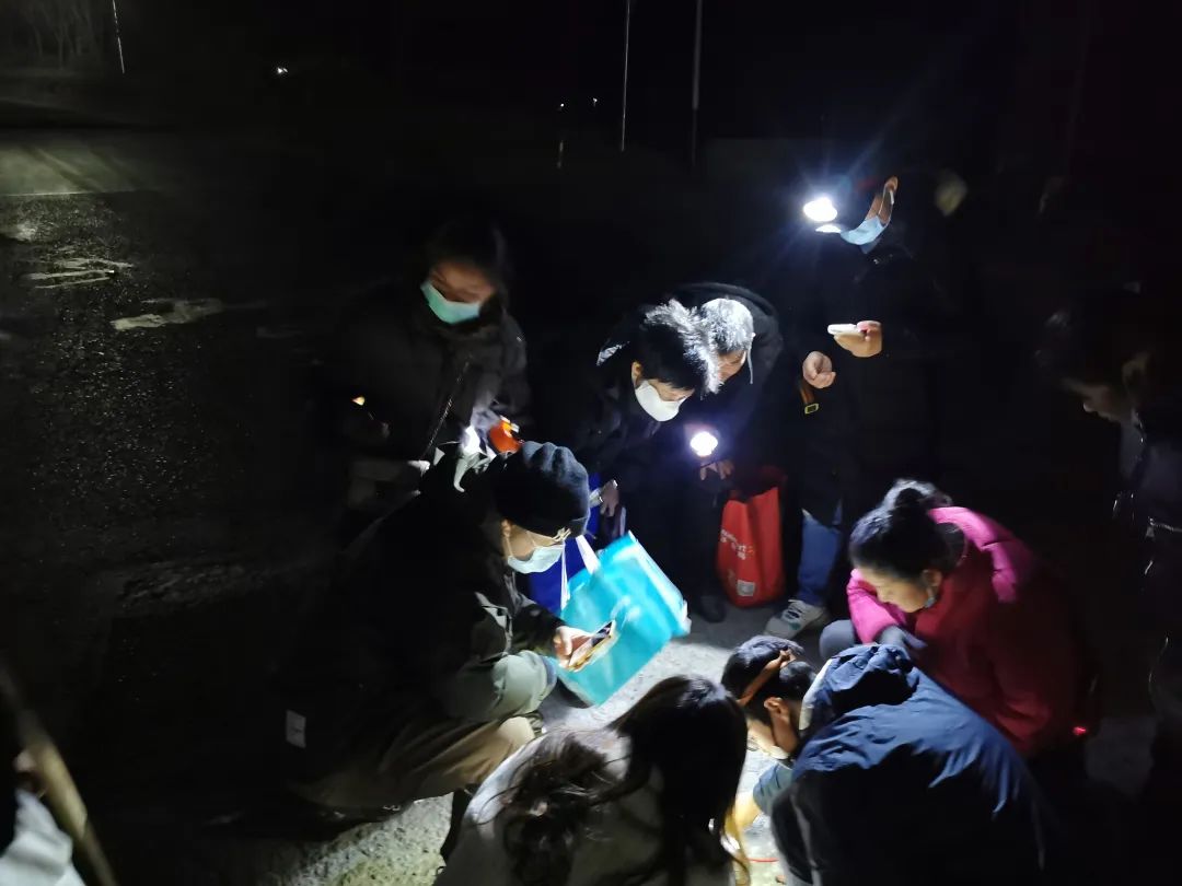 村庄鸡鸣声声,村道、农田里一束束灯光交织。