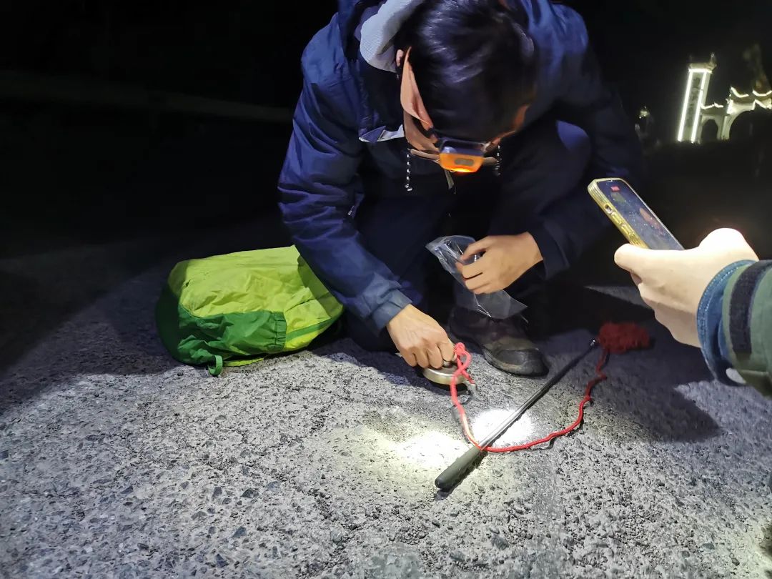 他停好车,头戴探灯,背双肩包,很快掏出磁铁杆、吸铁石,问着路就找到了发现第一块陨石碎片的地方——距离城头村村头不远处的王英来家。