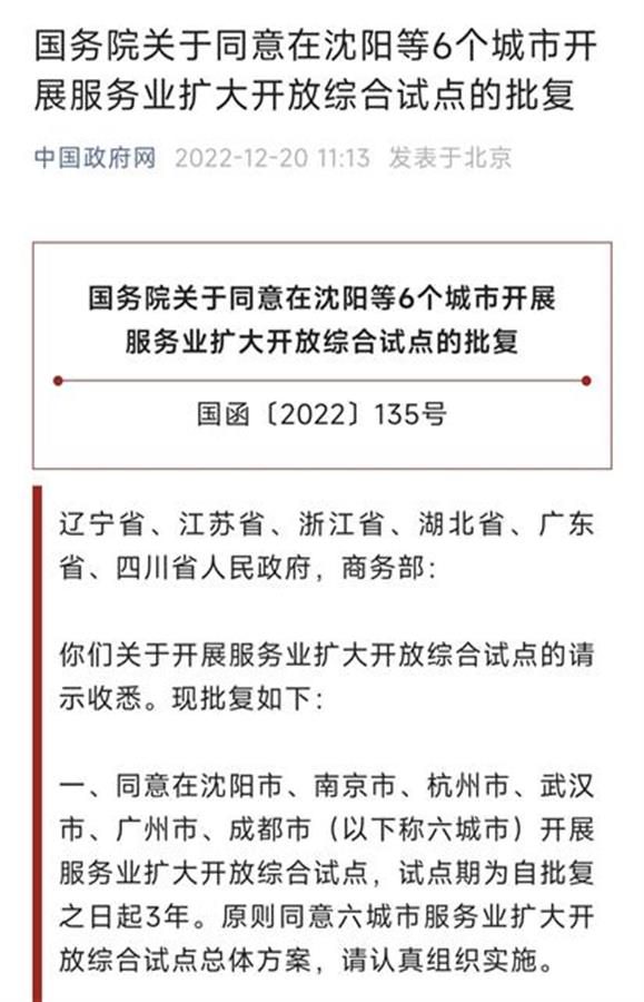 12月20日,国务院关于同意在沈阳等6个城市开展服务业扩大开放综合试点的批复公布,武汉名列其中。
