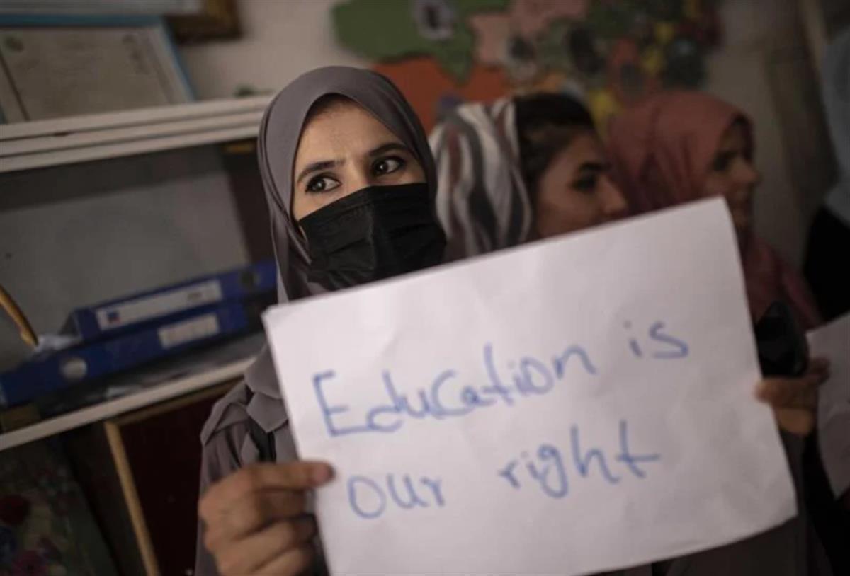 阿富汗妇女举标语要求保障女性的受教育权(图片来源:美联社)
