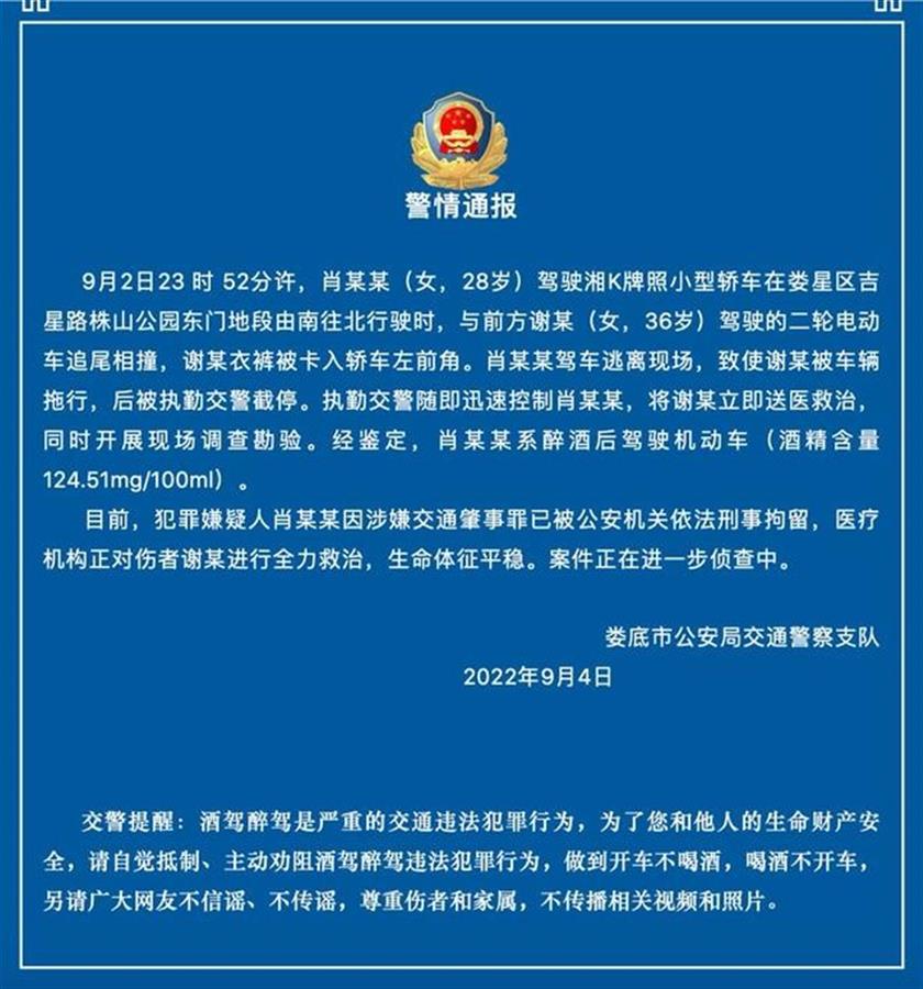 湖南省娄底市公安局交通警察支队此前曾发布警情通报:9月2日23时52分许,肖某某(女,28岁)驾驶湘K牌照小型轿车在娄星区吉星路株山公园东门地段由南往北行驶时,与前方谢某(女,36岁)驾驶的二轮电动车追尾相撞,谢某衣裤被卡入轿车左前角。肖某某驾车逃离现场,致使谢某被车辆拖行,后被执勤交警截停。执勤交警随即迅速控制肖某某,将谢某立即送医救治,同时开展现场调查勘验。经鉴定,肖某某系醉酒后驾驶机动车(酒精含量124.51mg/100ml)。目前,犯罪嫌疑人肖某某因涉嫌交通肇事罪已被公安机关依法刑事拘留。