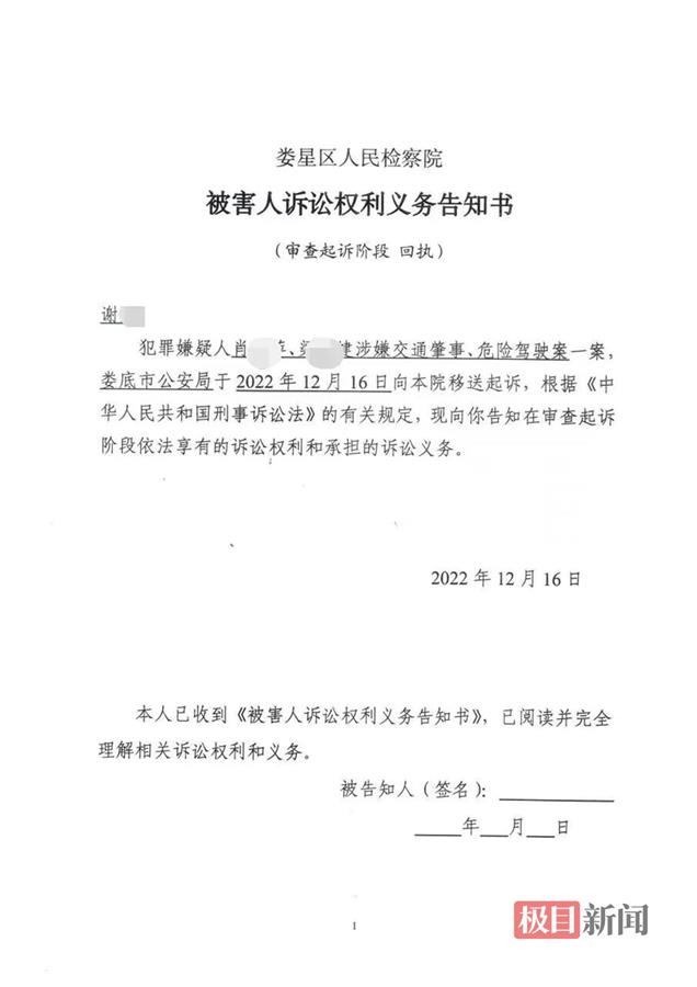 3个多月的前夜晚,湖南娄底一女性司机肖某某醉酒后驾驶一辆宝马机动车,追尾一辆二轮电动车后将被撞女子谢某拖行,直至被交警截停,犯罪嫌疑人肖某某因涉嫌交通肇事罪被公安机关依法刑事拘留。12月22日,极目新闻记者从被撞女子谢某家属处获悉,已在21日收到了娄底市娄星区人民检察院送达的被害人诉讼权利义务告知书,目前受伤的谢某依然在医院重症监护室治疗。