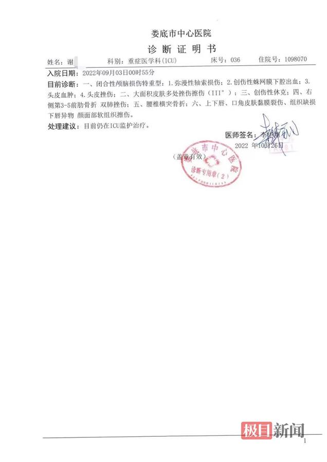 12月22日,被撞女子谢某的丈夫周先生告诉极目新闻记者,他们家属是9月3日从交警处获悉车祸发生,他的妻子还在娄底当地一家医院的重症监护室接受治疗,现在还不能讲话。