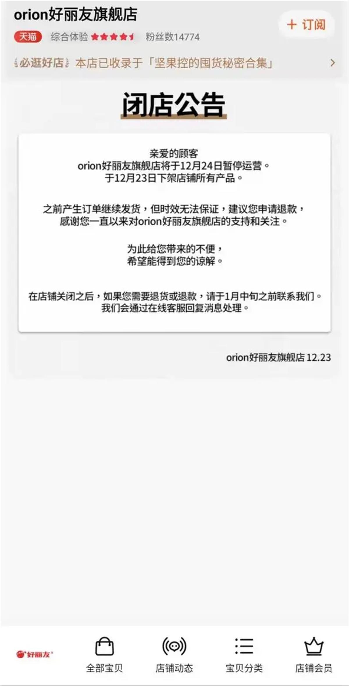 该店12月23日发布的公告显示,该店于12月23日下架店铺所有产品,于12月24日暂停运营。公告称,之前产生的订单继续发货,但时效无法保证,建议申请退款。在店铺关闭之后,如果需要退货或退款,请于1月中旬之前联系,会通过在线客服回复消息处理。