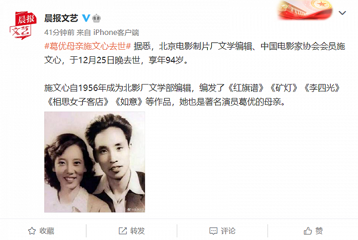 北京电影制片厂文学编辑、中国电影家协会会员施文心,于12月25日晚去世,享年94岁。