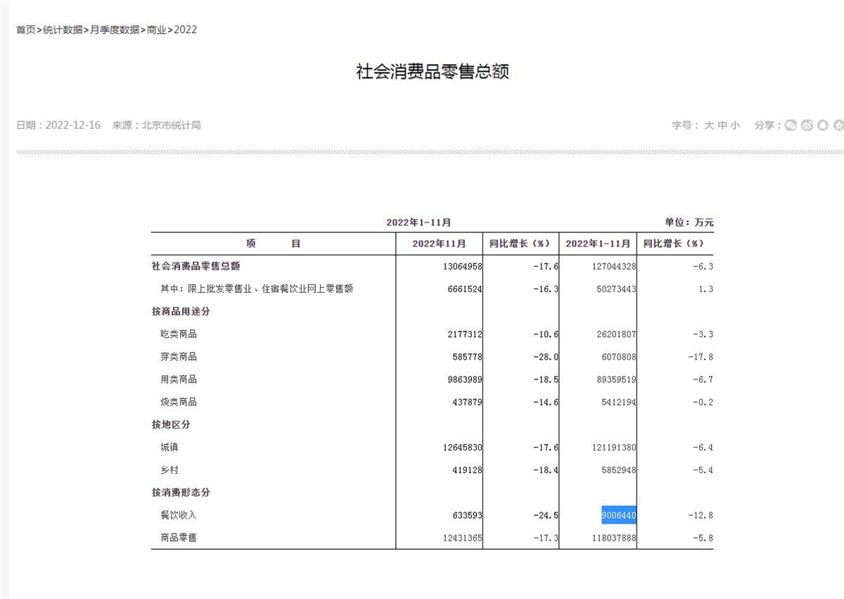 根据上海市和北京市统计局官方网站数据显示,2022年1-11月,上海市住宿餐饮业收入为1038亿,比去年同期下降21.9%。同期,北京市餐饮收入为900亿元,同比下降12.8%。