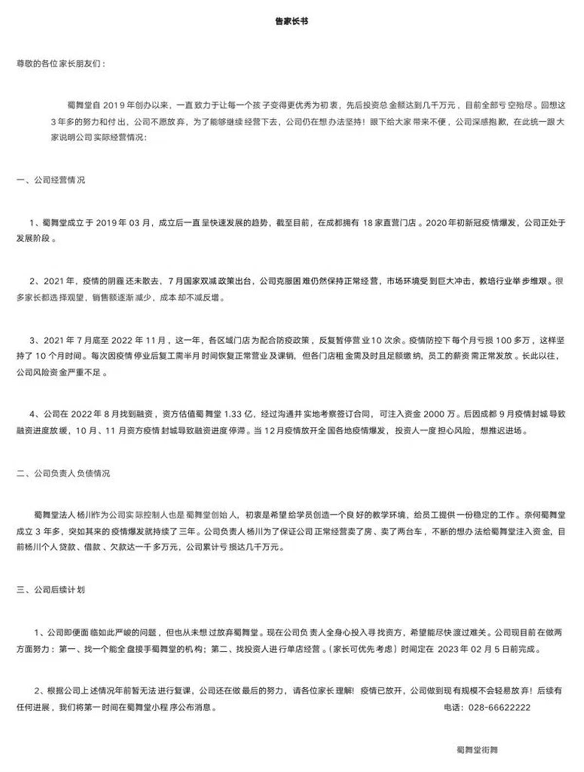 蜀舞堂在信中表示,公司自2019年创办以来投资总金额达数千万元,目前全部亏空殆尽,暂无法复课,后续有进展会第一时间公布消息。