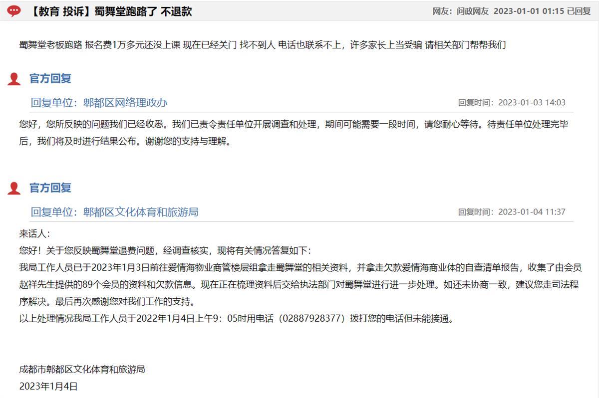 此外,记者注意到在问政四川平台,也有多条关于蜀舞堂跑路的投诉。郫都区文化体育和旅游局1月4日回复称,该局工作人员已收集会员资料和欠款信息,梳理资料后交给执法部门进行进一步处理。如还未协商一致,建议走司法程序解决。