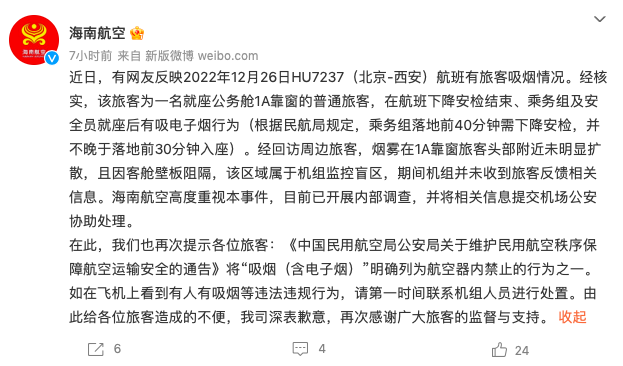 1月5日,据@海南航空消息,近日,有网友反映2022年12月26日HU7237(北京-西安)航班有旅客吸烟情况。经核实,该旅客为一名就座公务舱1A靠窗的普通旅客,在航班下降安检结束、乘务组及安全员就座后有吸电子烟行为(根据民航局规定,乘务组落地前40分钟需下降安检,并不晚于落地前30分钟入座)。经回访周边旅客,烟雾在1A靠窗旅客头部附近未明显扩散,且因客舱壁板阻隔,该区域属于机组监控盲区,期间机组并未收到旅客反馈相关信息。海南航空高度重视本事件,目前已开展内部调查,并将相关信息提交机场公安协助处理。