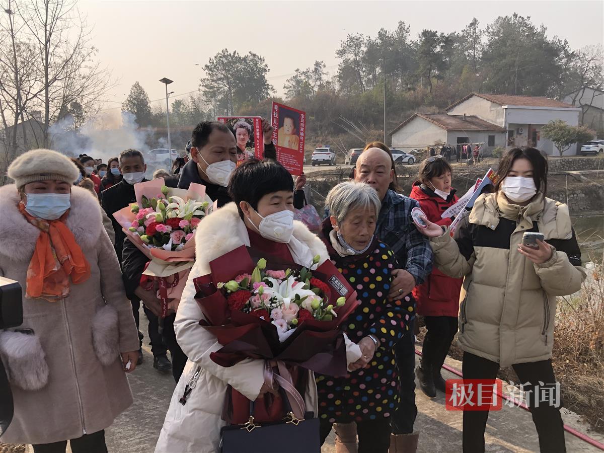 杨义娥姐弟手捧鲜花 在亲人簇拥下步入离别了47年的家