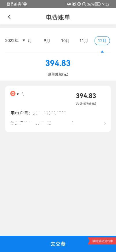 点击首页“电费账单”,再点击您需要查看的户号卡片,选择所需要查看的月份,即可查看您选择月份的电费账单信息。