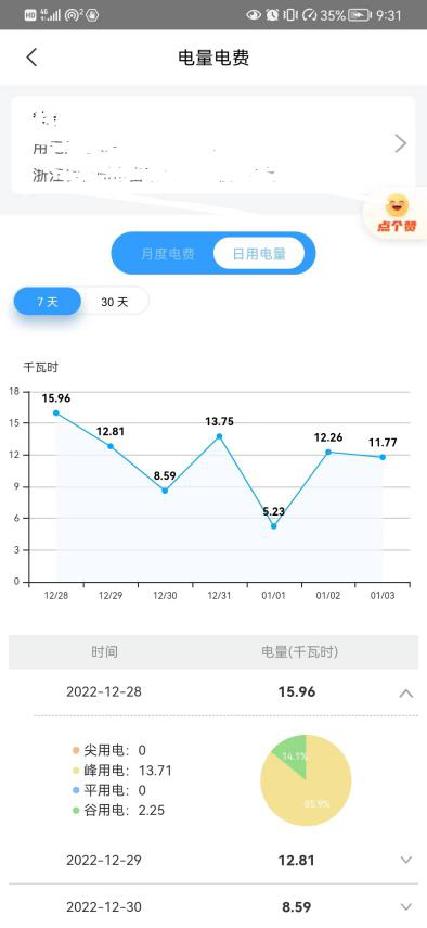 点击首页“电量电费”,“月度电费”可查看每月电量电费信息,“日用电量”可以查看家里每天的详细用电情况,帮您快速了解电费明细。