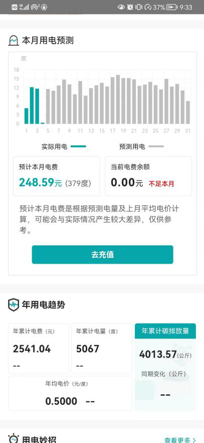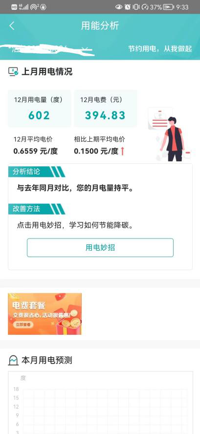 点击首页“用能分析”,“上月用电情况”直观展示上月用电量、电费、平均电价情况,并自动对比前一年同一时期用电情况,让家里的电用得明白、更透明。“本月用电预测”结合您历史用电趋势,以柱状图的形式对本月未发生用电量进行预测,帮助您了解本月累计用电量,更加合理地制定用电规划。