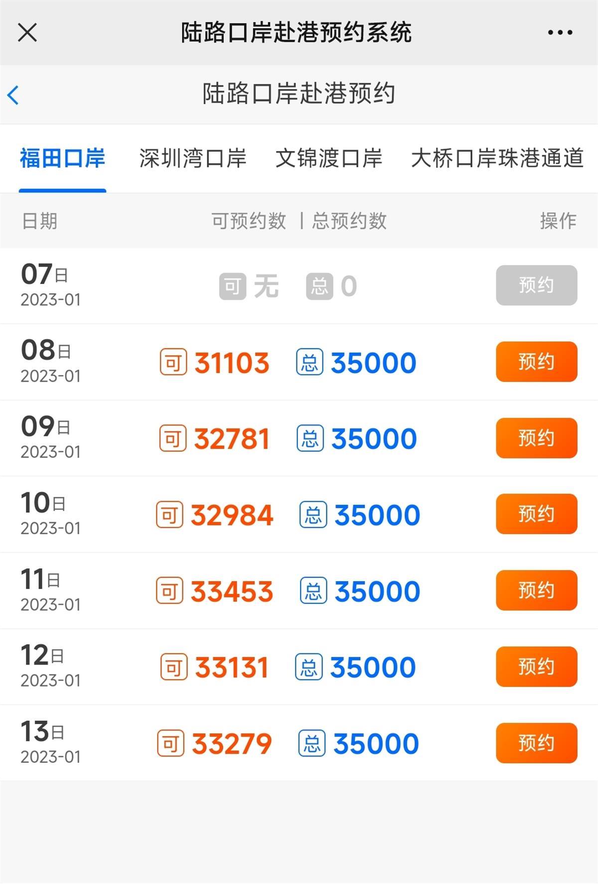 不少内地游客期待通关已久。广州市民陈女士计划在1月中旬赴港旅游,看演唱会,6日21时许,她通过“深圳口岸发布”公众号的陆路口岸赴港系统,顺利预约到了从深圳湾口岸前往香港的名额。“现在最早可以预约到一周后的名额,13日当天预约赴港的人数还不是很多,很快就预约上了。”预约之后,她还要办理香港旅行签注,因为现在她还没办完签注,心里有些着急。