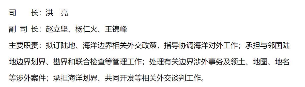 官网信息显示,边界与海洋事务司主要职责为:拟订陆地、海洋边界相关外交政策,指导协调海洋对外工作;承担与邻国陆地边界划界、勘界和联合检查等管理工作;处理有关边界涉外事务及领土、地图、地名等涉外案件;承担海洋划界、共同开发等相关外交谈判工作。