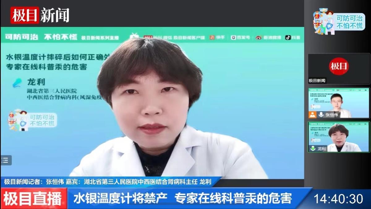 近期,各种温度计成为线上线下紧俏商品。不过,近日有消息称,我国自2026年1月1日起,将禁止生产含汞体温计,这也让水银温度计又引发关注。那么,汞的危害有哪些?不慎摔碎水银温度计后该如何正确处理?1月10日下午14点半,湖北省第三人民医院(湖北省中山医院)中西医结合肾病内科(风湿免疫科)主任龙利做客“可防可治 不怕不慌”极目新闻系列直播节目,全平台共计21.5万人在线收看。