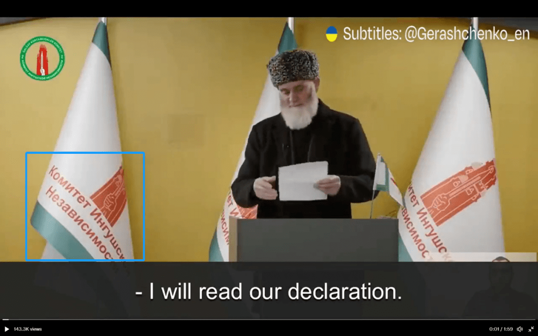杰拉先科在推文中没有提到视频中发言的男子的具体身份。仔细观察该男子身后的旗帜,可以发现,该旗帜上有一明显的红色标志,标志下方写有“印古什独立委员会”(Комитет Ингушск Независимост)的字样。