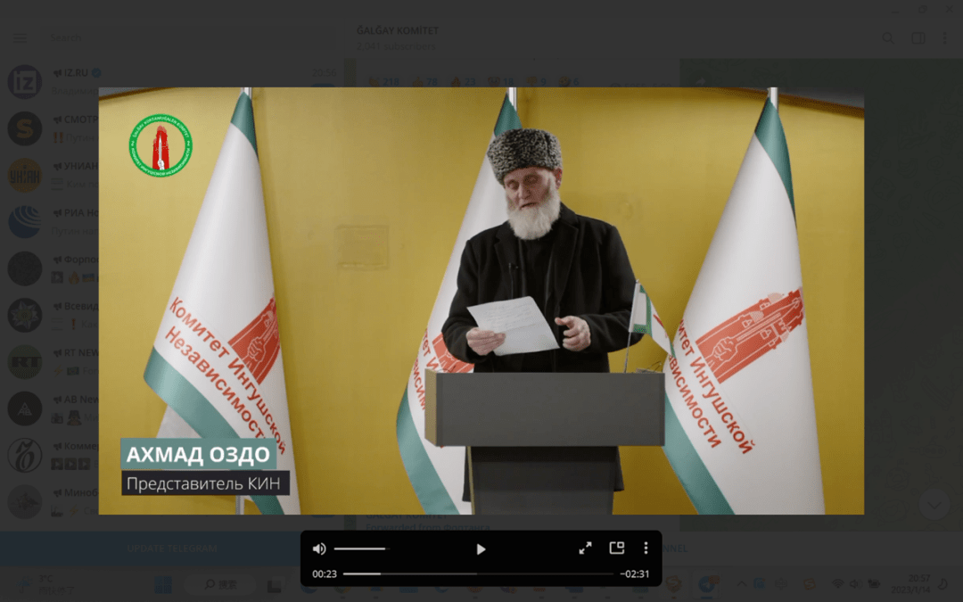 “印古什独立委员会”的Telegram频道也在1月10日发布了一段2分54秒的视频,清楚地注明了奥兹作为发言者的身份。经核查,杰拉先科发布的视频正是截取了该视频第20秒至2分20秒左右的内容,且其使用的英文翻译的字幕条恰好遮挡了原视频中对奥兹的介绍。