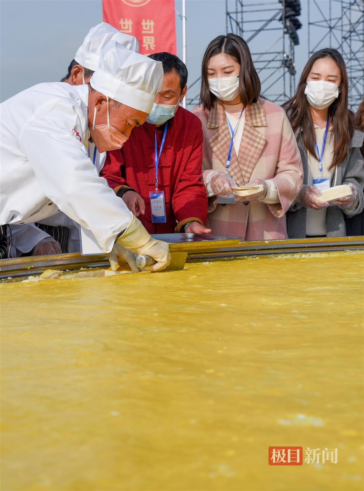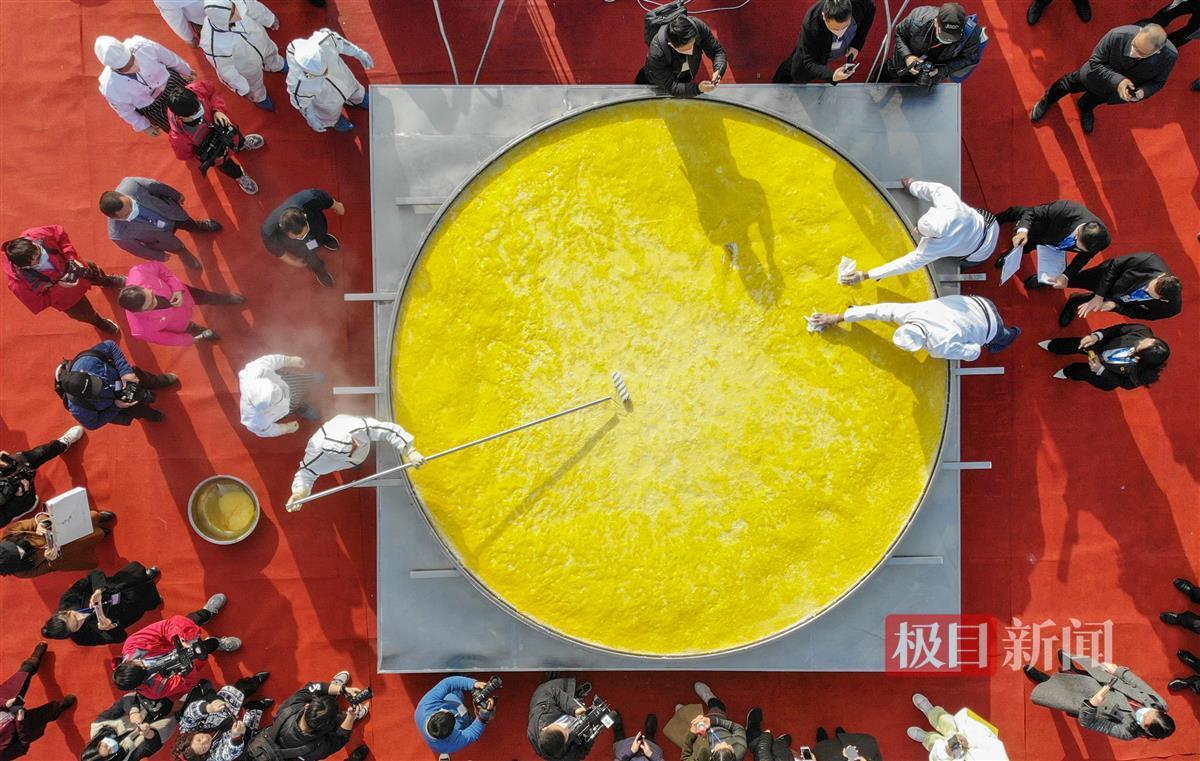 “鱼糕直径为4.28米,面积约为14.4平方米。该鱼糕打破之前的世界纪录,被认定为是世界上最大的鱼糕。”2022年3月23日,荆州市江陵县马家寨乡长江村,20多名厨师联合制作的鱼糕,成为“世界最大鱼糕”,打破了公安县此前的记录。