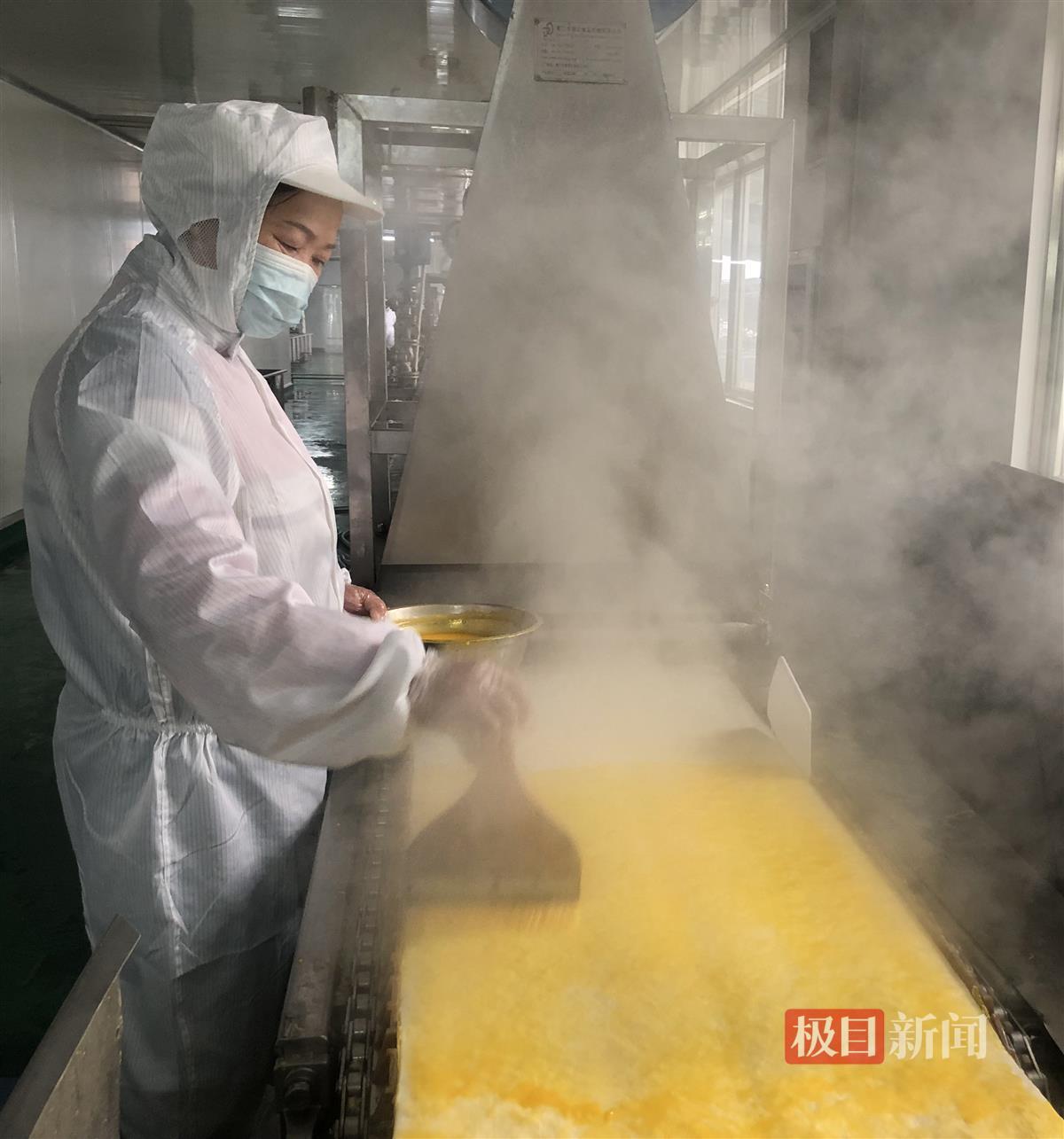 除了人工宰杀草鱼原料外,鱼糕的机器化生产基本实现了无人化、少人化。极目新闻记者在生产车间看到,工人将机器打浆后的鱼糜、猪肉肥膘等混合物均匀投入传送带,经过一条约30米的蒸线加热,鱼糕便完成了七成。在流水线的尾端,一名工人刷上蛋黄,再经过约5分钟的蒸煮,荆州鱼糕便成型。