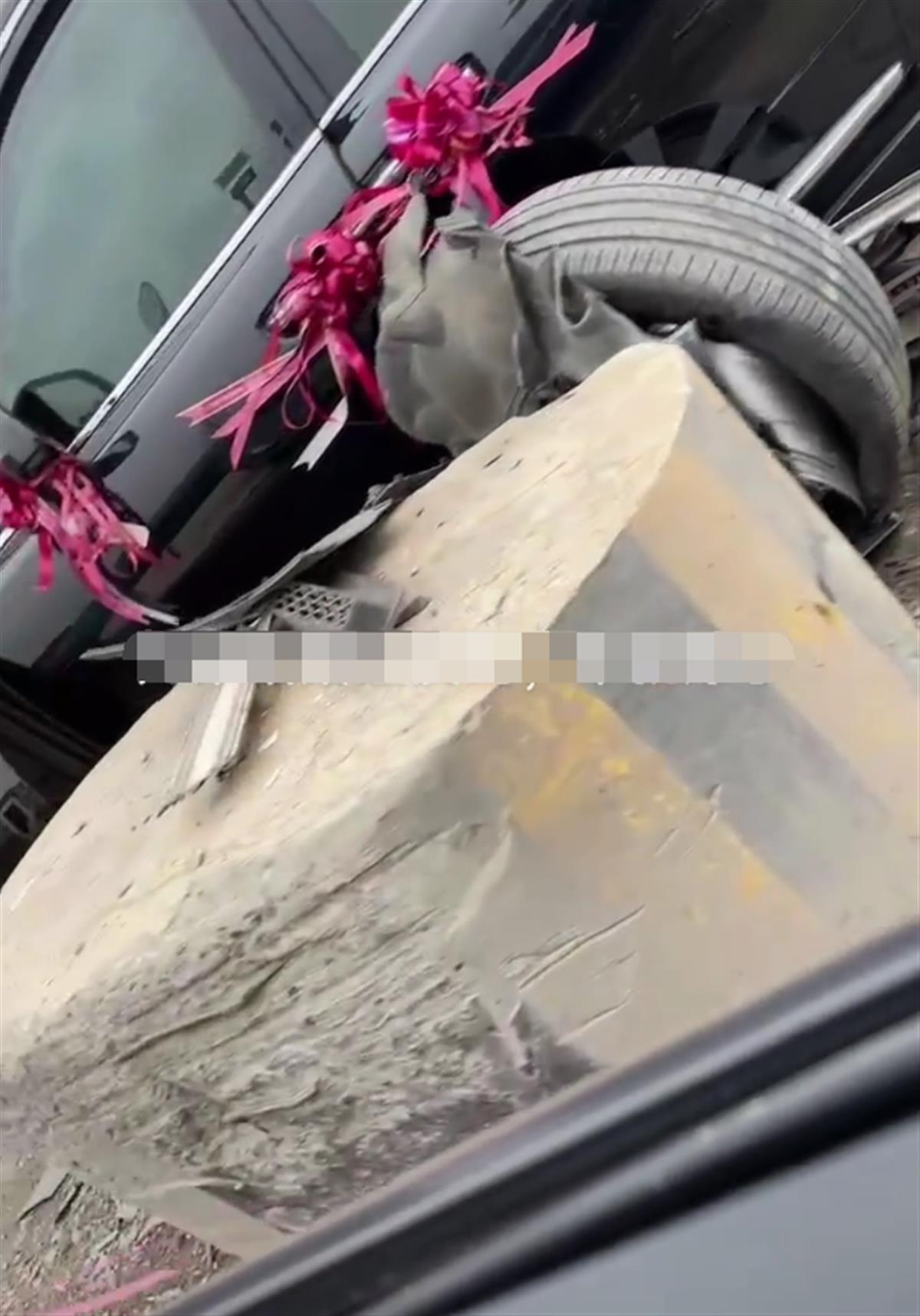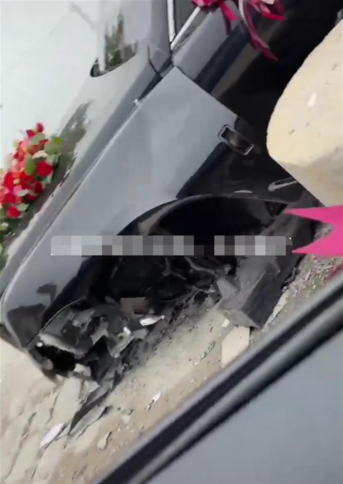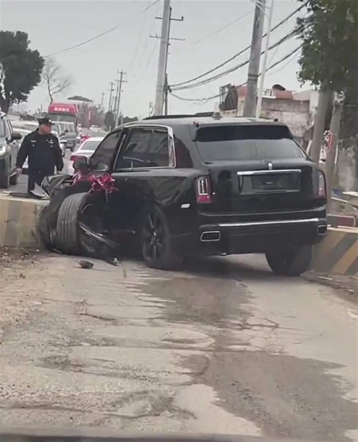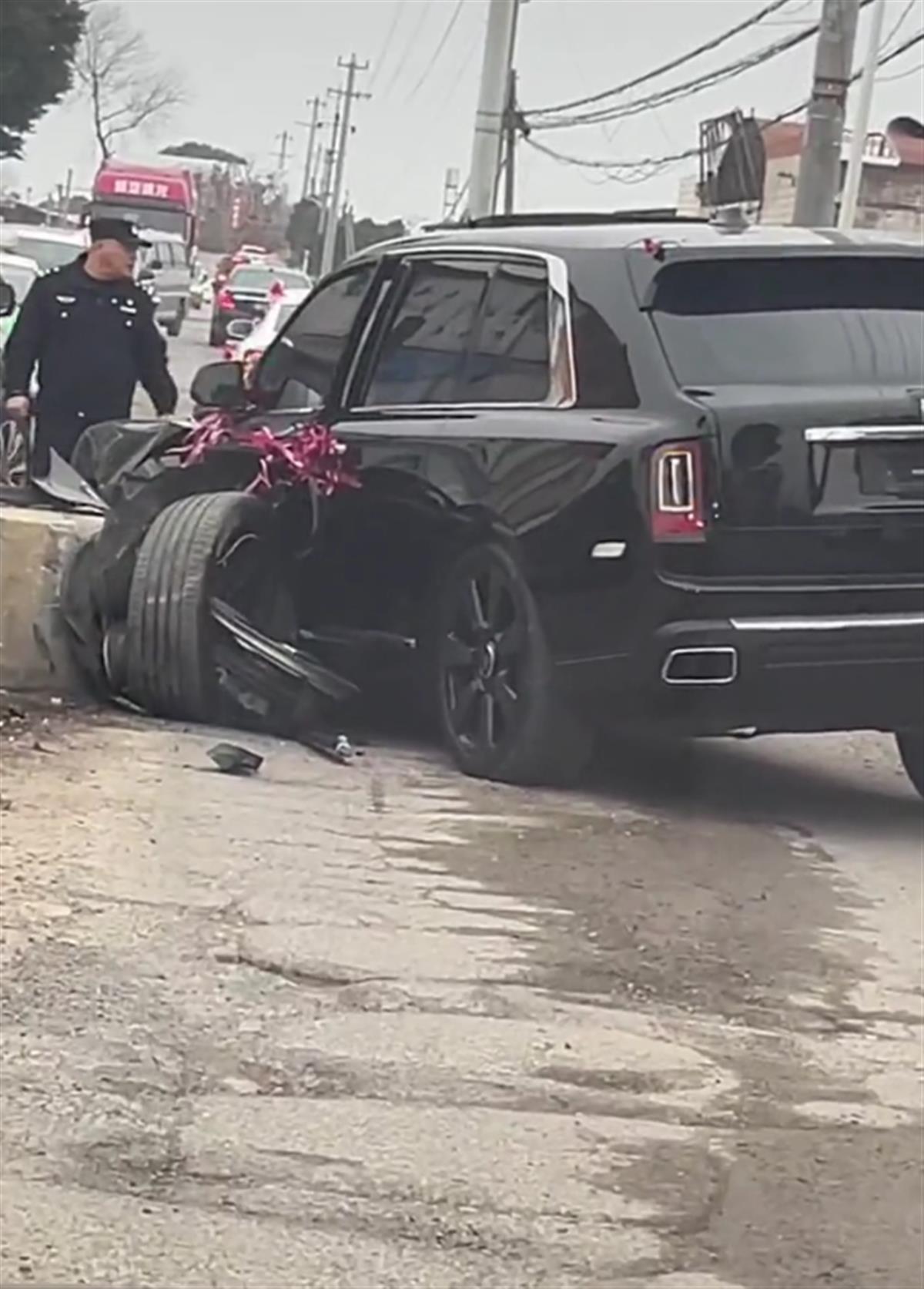 一条乡村道路上,一辆黑色劳斯莱斯库里南婚车撞上路边一个石墩,车头左侧受损严重,左前轮脱落,上述视频引发网友关注。