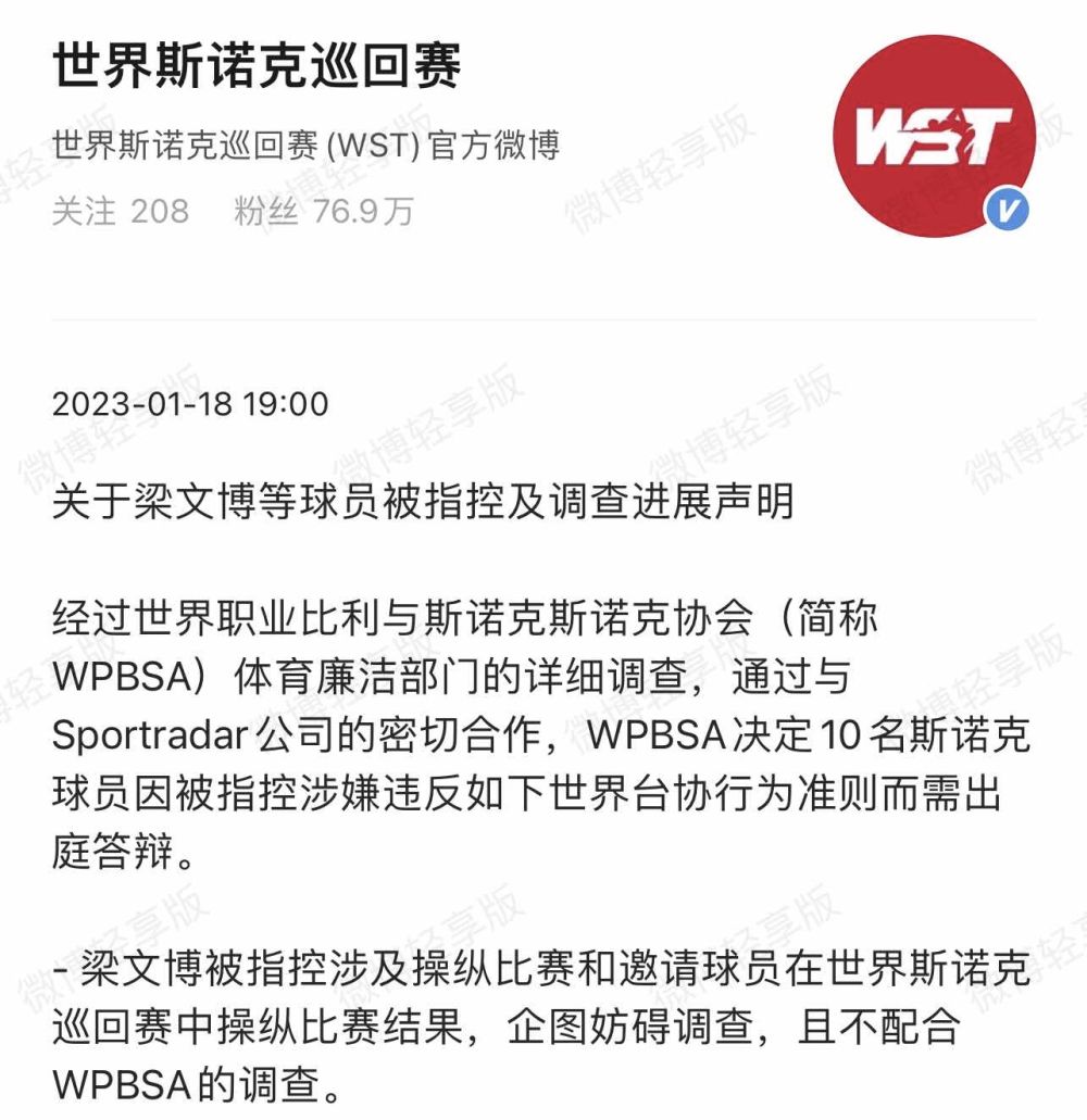 在当日发布的《关于梁文博等球员被指控及调查进展声明》中,世台联称,经过世台联体育廉洁部门的详细调查,以及通过与体育数据公司“体育雷达”的密切合作,世台联决定,10名球员因被指控涉嫌违反如下世台联行为准则而需出庭答辩。