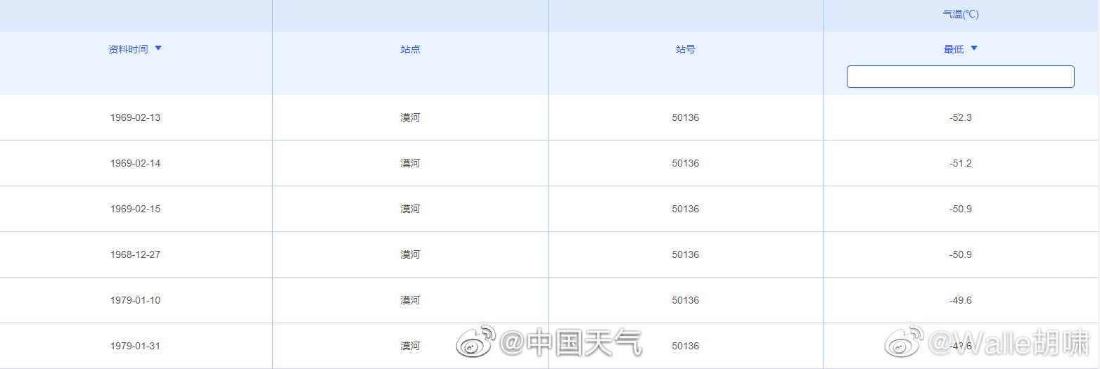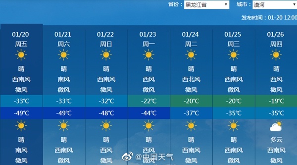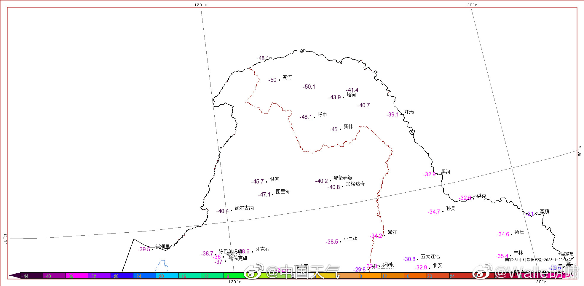除了漠河,今天早晨,黑龙江呼中、北极村及内蒙古图里河等地也极其寒冷,分别出现了-48.1℃、-47.1℃低温。