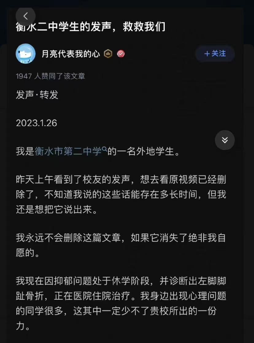 1月26日,一位ID名为“月亮代表我的心”的网友以衡水二中学生身份发文称,自己遭遇体罚受伤就医,还因抑郁问题休学。该网友还称,在衡水二中体罚学生成常态。1月19日,该篇文章在网络大量传播,引发了大众对于衡水二中是否存在对学生进行体罚等违规行径的关注。