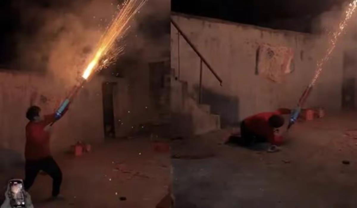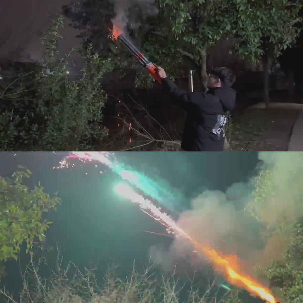 山东大妈“入戏”燃放加特林烟花(视频截图)