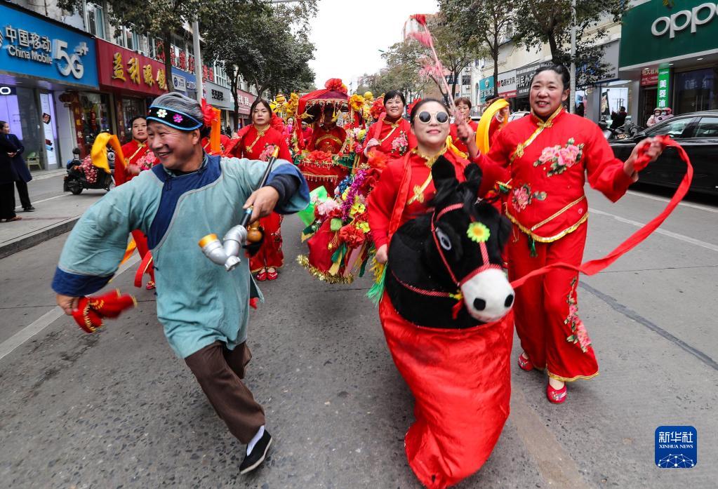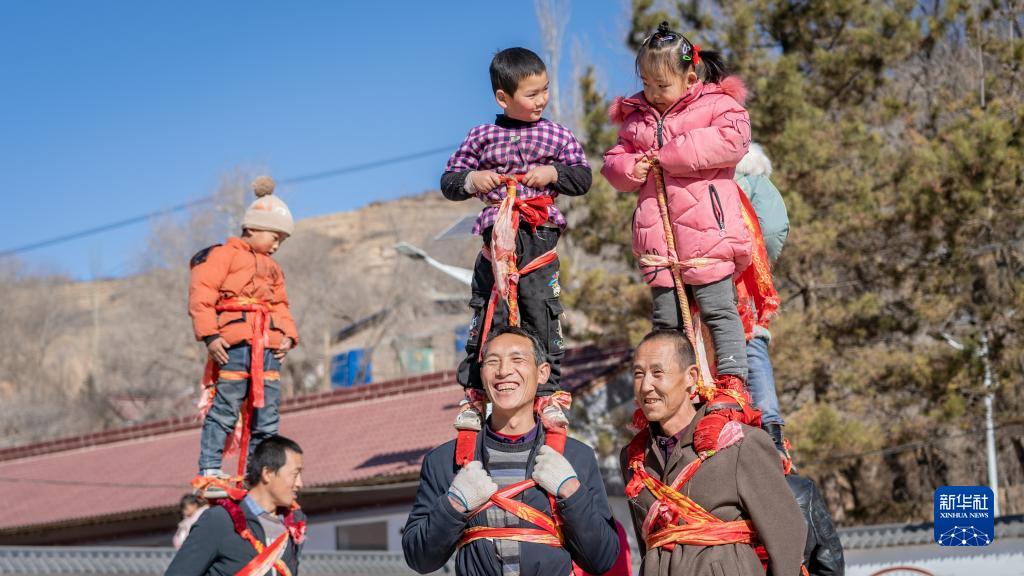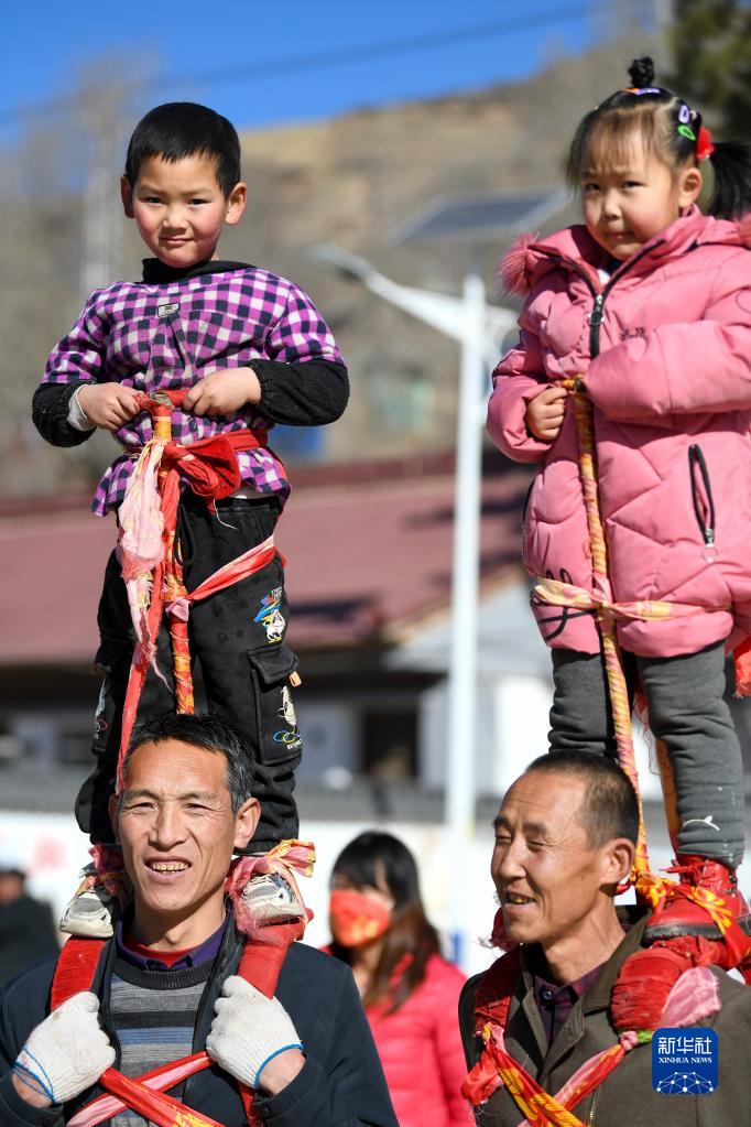 2月3日,宁夏固原市隆德县观庄乡阳洼村村民在排练扛社火。扛社火是由身强力壮的成年男子肩扛起年龄较小的孩子,扮演成各种不同的戏曲人物,在行走中进行表演,是社火演出的一种形式。