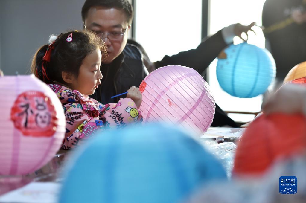 2月3日,在河北省石家庄市井陉县文旅产业孵化园,小朋友和家长一起手绘彩灯。