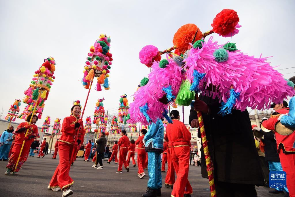 2月3日,河北省邯郸市峰峰矿区义井镇东王看村村民在表演“苇子灯阵”。